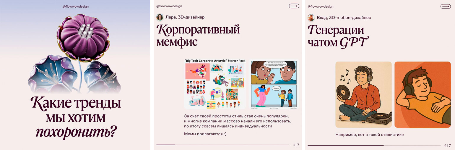 Так появился наш суббренд — своего рода фестивальная версия Flowwow. Здесь, в айдентике канала, мы можем отходить от фирменных цветов и свободнее использовать мемы.