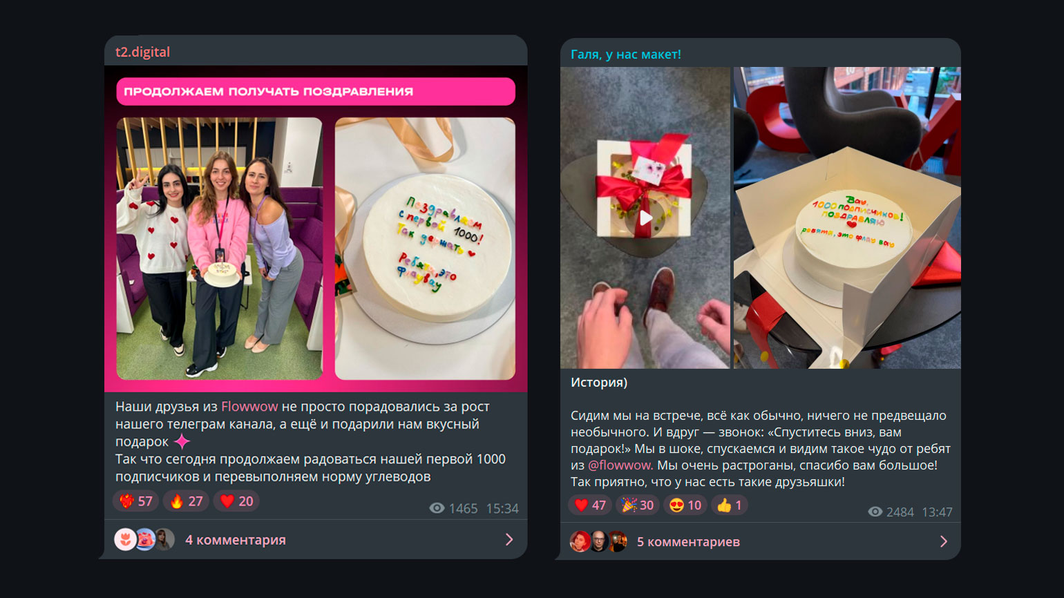 У канала не было цели продвигать бренд Flowwow — этим занимаются команды бренда, PR или SMM. Тем не менее когда в канале дизайнеров t2 набралась 1000 подписчиков, мы отправили им бенто-торт от команды.