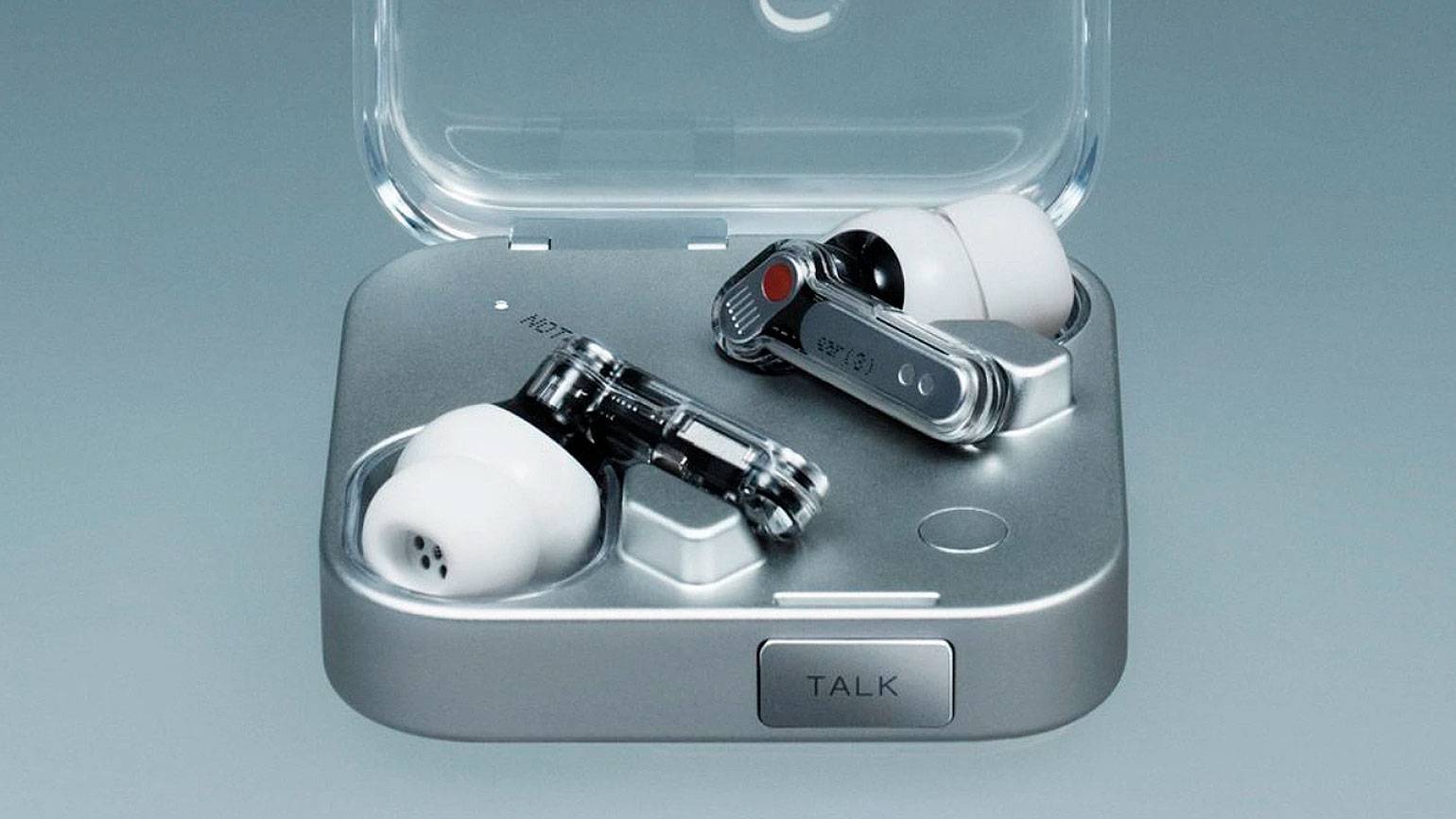 Пример — Nothing Ear (3). Металлические элементы интегрированы в прозрачный корпус, а кейс сделан из 100% переработанного алюминия.