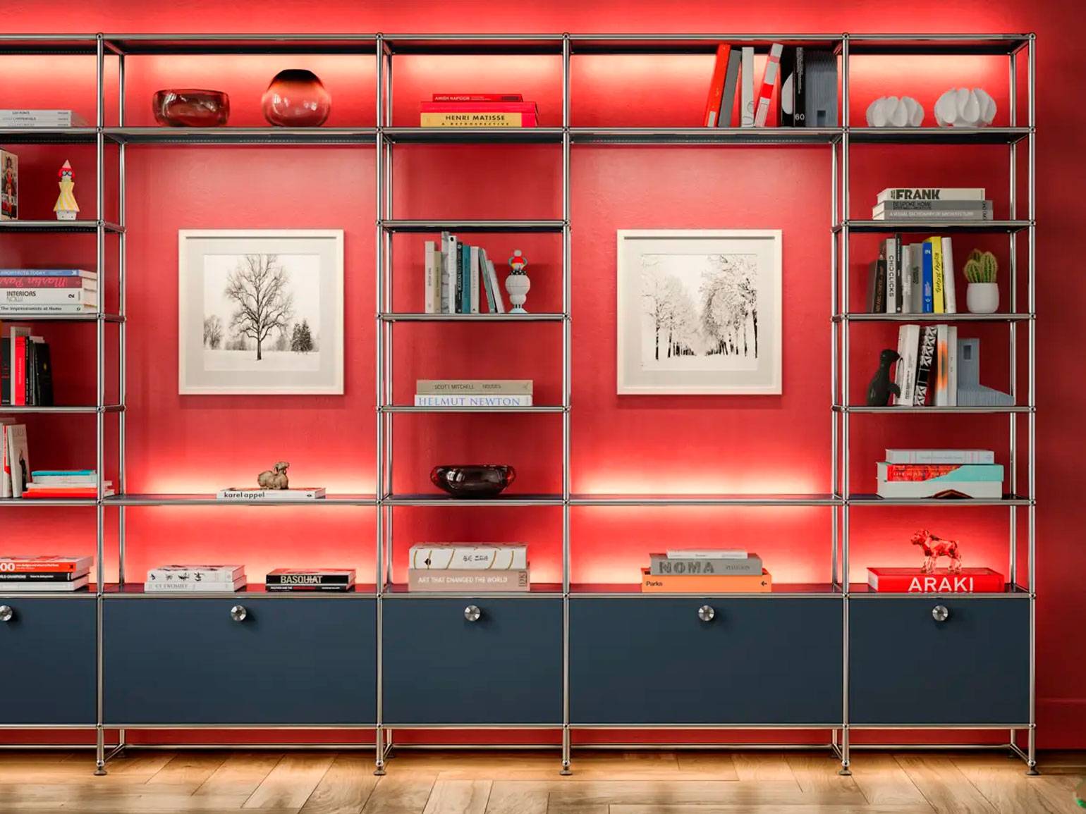 Пример — USM Haller. Компания выпустила стеллаж USM Haller E с беспроводной зарядкой и светом прямо в конструкции, а также модуль с пеленальным столиком.