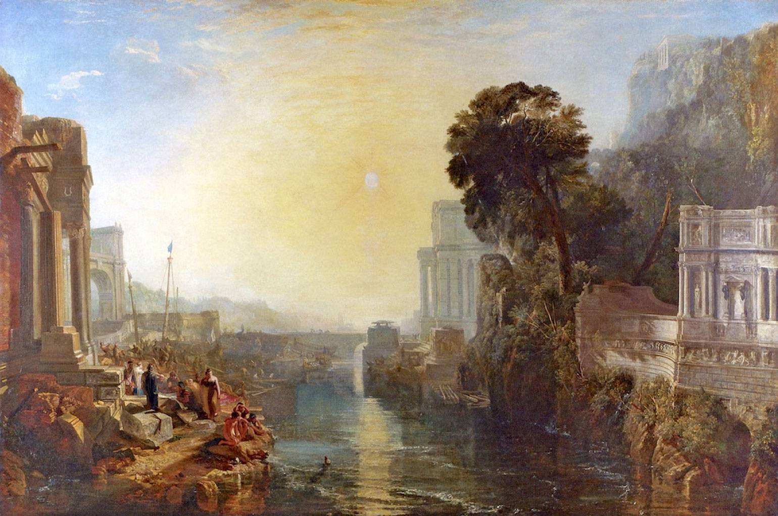 В «Падении Карфагенской империи», казалось бы, похожей на предыдущую работу, правила игры меняются кардинально. Тёрнер изгибает пространство: лестница, круговой причал, наклон колонн и стен, а также воронка закатных облаков — всё создаёт ощущение закрученного движения, хотя сцена почти статична.