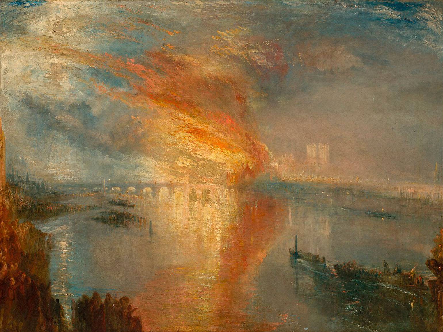 В 1834 год в здании Британского парламента случился пожар. Тёрнер видел его своими глазами и успел сделать множество зарисовок, которые потом стали двумя мощными полотнами.