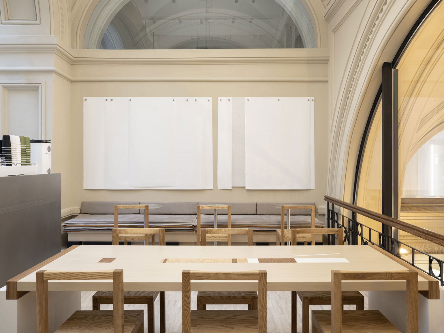 Пространство спроектировала Movs Studio. Дизайнеры встроили современный интерьер в историческую архитектуру здания. Одной из ключевых особенностей кафе стало большое арочное окно с видом на Никольскую улицу. Благодаря ему небольшое помещение кажется светлым и открытым.