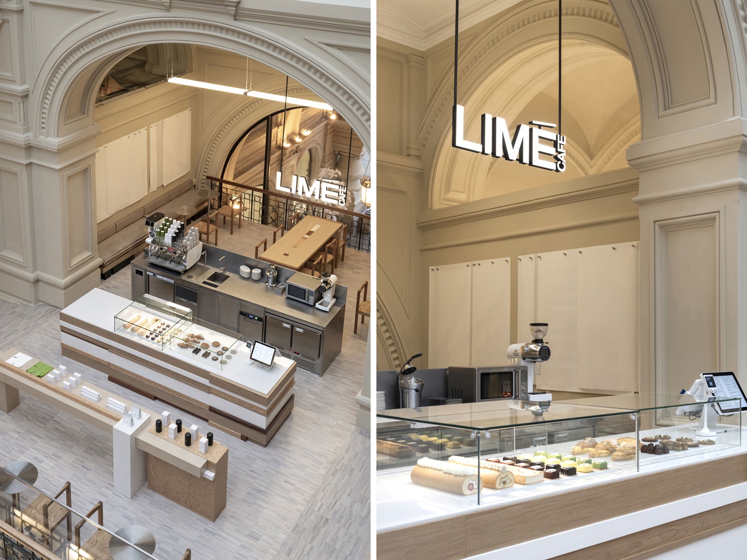 Витрина с десертами и стол для мерча выполнены из нескольких пород шпона со срезами, а строгая геометрия мебели — преимущественно прямоугольной — вписана в пространство с арками. Отдельное внимание уделили фактуре и деталям: металлические элементы, например, подставки для приборов вписаны в интерьер, а не спрятаны.