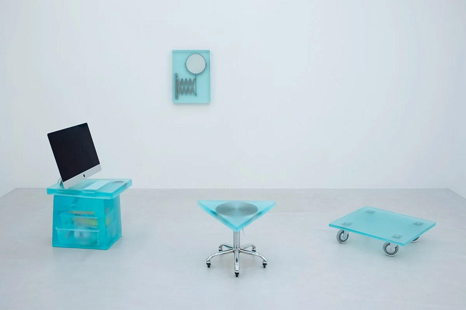 В Dip2 студийный табурет трансформируется в аморфную треугольную форму: исходное сиденье угадывается внутри объёма, но теряет прежнюю читаемость. Dip3 лишает регулируемое зеркало его основной функции — отражения: после заливки смолой оно становится полупрозрачной скульптурой. В Dip4 сломанная тележка получает новую столешницу из смолы и превращается в низкий стол — колёса остаются, но уже не работают.