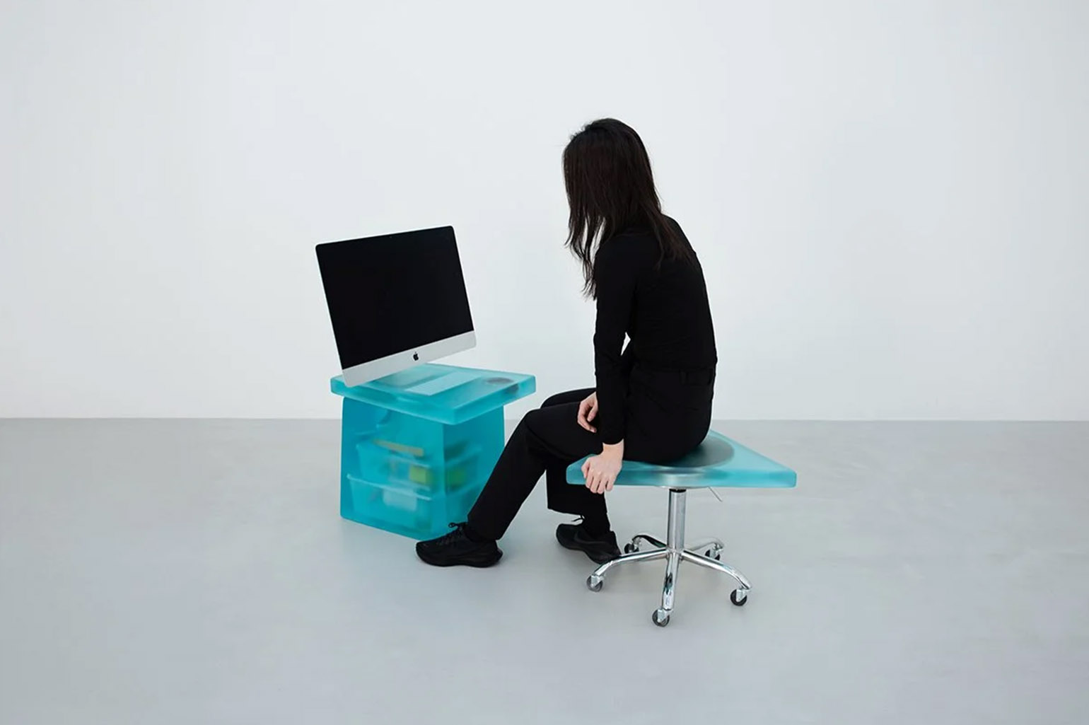 Каждый объект серии демонстрирует радикальное функциональное смещение. В работе Dip1 старый iMac становится спинкой кресла: экран остаётся узнаваемым, тогда как клавиатура и другие элементы будто растворяются под слоем смолы. Этот эффект визуально передаёт идею размывания воспоминаний — одни детали сохраняют чёткость, другие уходят в полупрозрачную глубину.