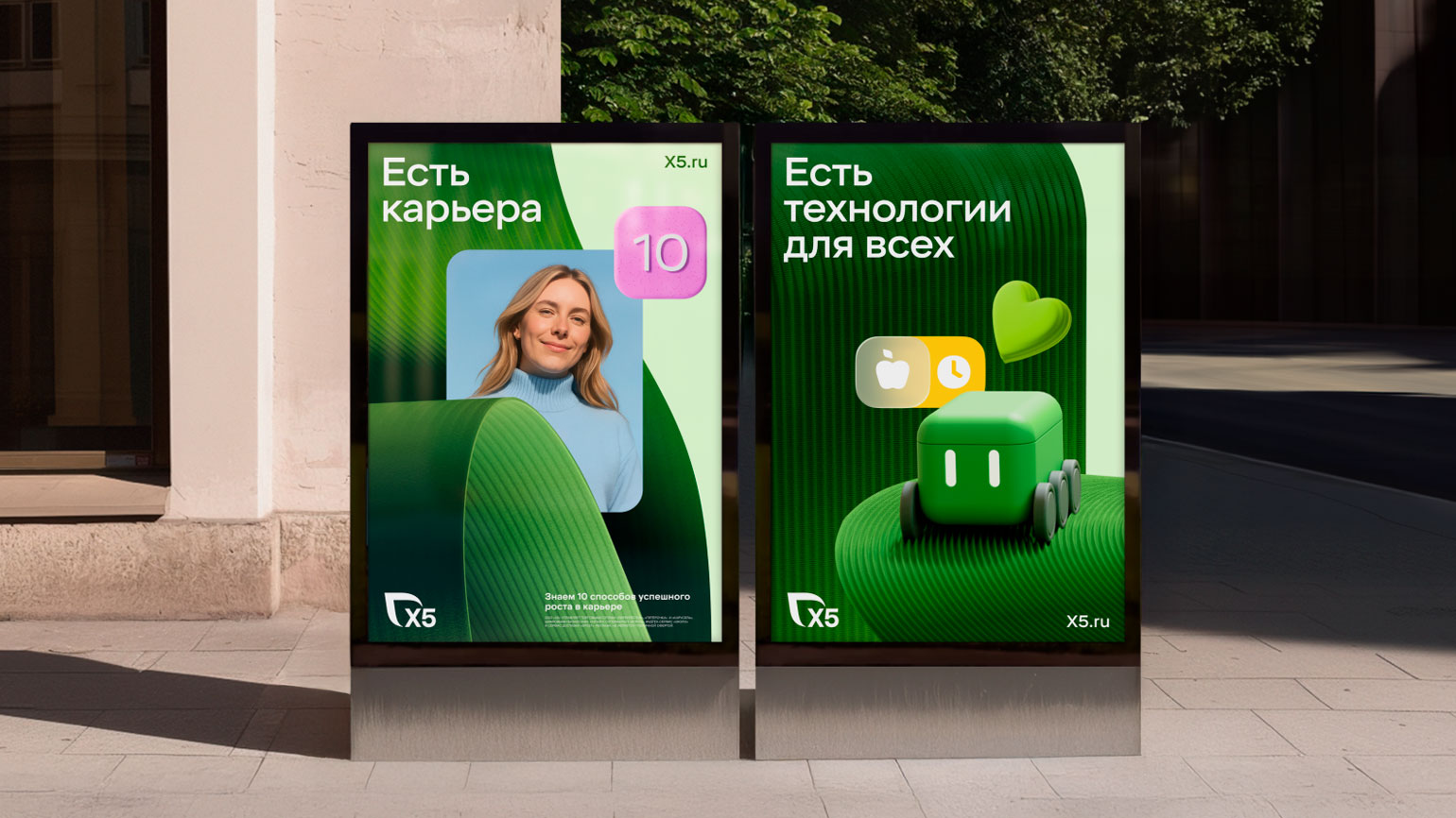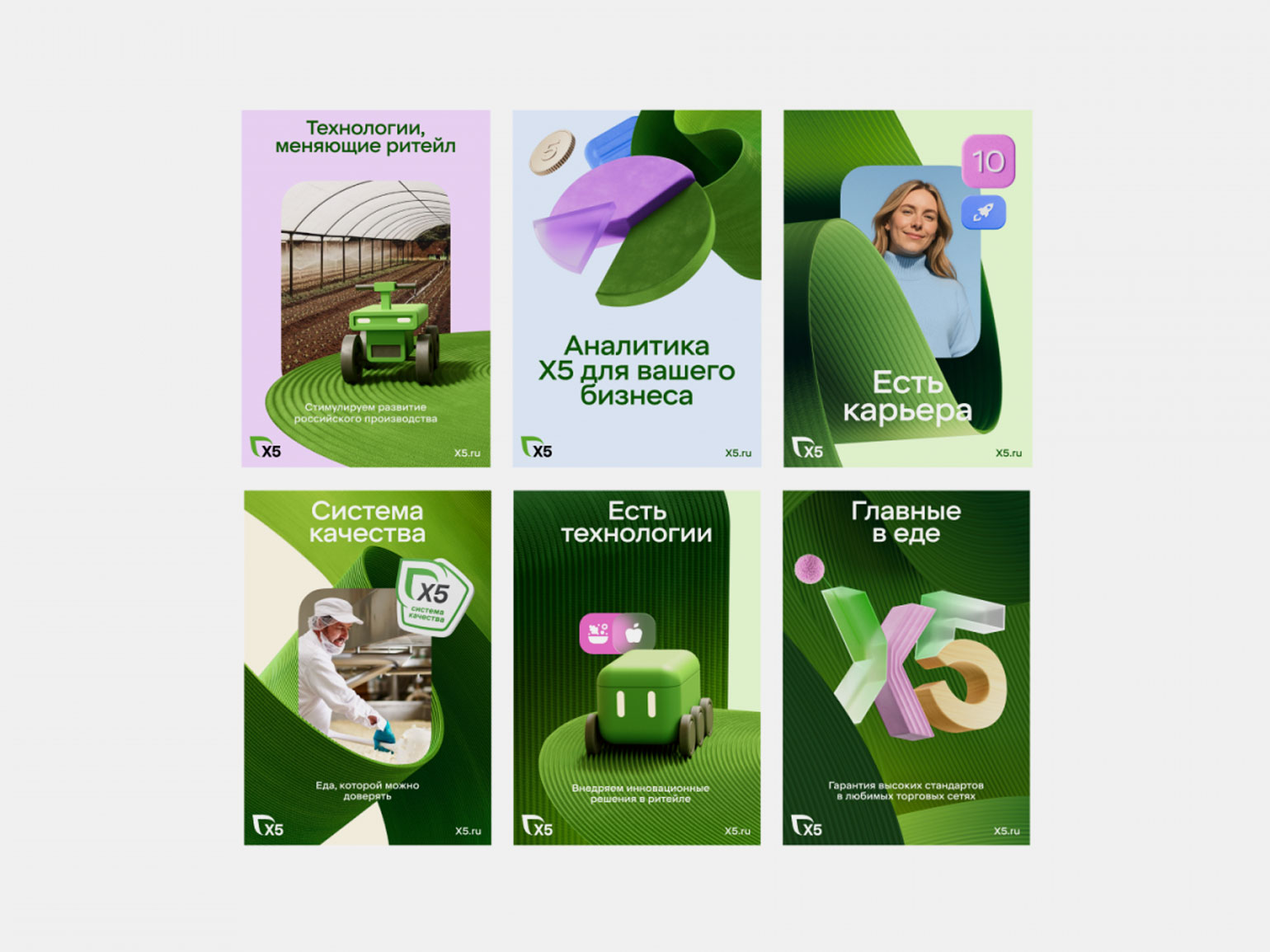 Визуальная система построена по принципу конструктора — внутренние команды могут быстро собирать макеты для разных каналов без привлечения сложных ресурсов. Новая айдентика уже используется в рекламных кампаниях X5, в специальных проектах и в HR-коммуникациях.