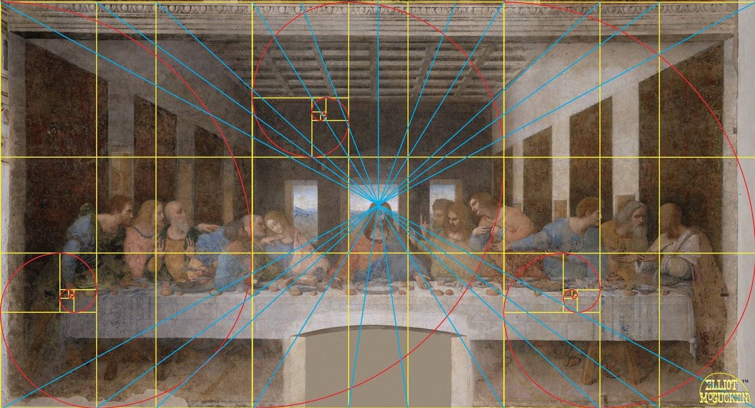 Леонардо да Винчи применял этот изобразительный принцип в своём творчестве. Его «Тайная вечеря» вся состоит из элементов, вписанных в геометрические фигуры, построенные по правилу золотого сечения.