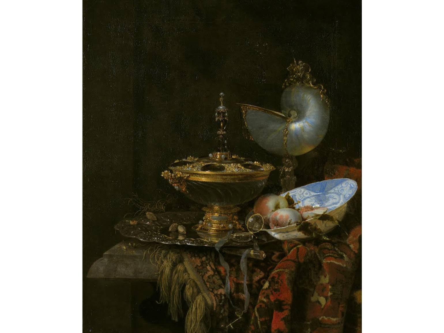 Изображение: картина Виллема Кальфа «Великолепный натюрморт с чашей Хольбейна, „Наутилусом“, стеклянным бокалом и фруктовой вазой», 1678 / Statens Museum for Kunst