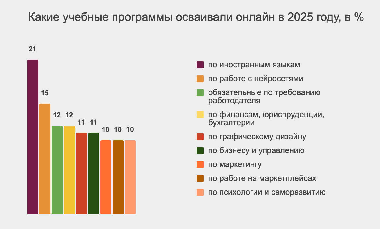 Что касается провайдера обучения, судя по всему, выбор зависит от тематики: почти с одинаковой частотой в 2025 году опрошенные учились в специализированных онлайн-школах (22%), на многопрофильных платформах (20%) и на авторских курсах блогеров и экспертов (18%).