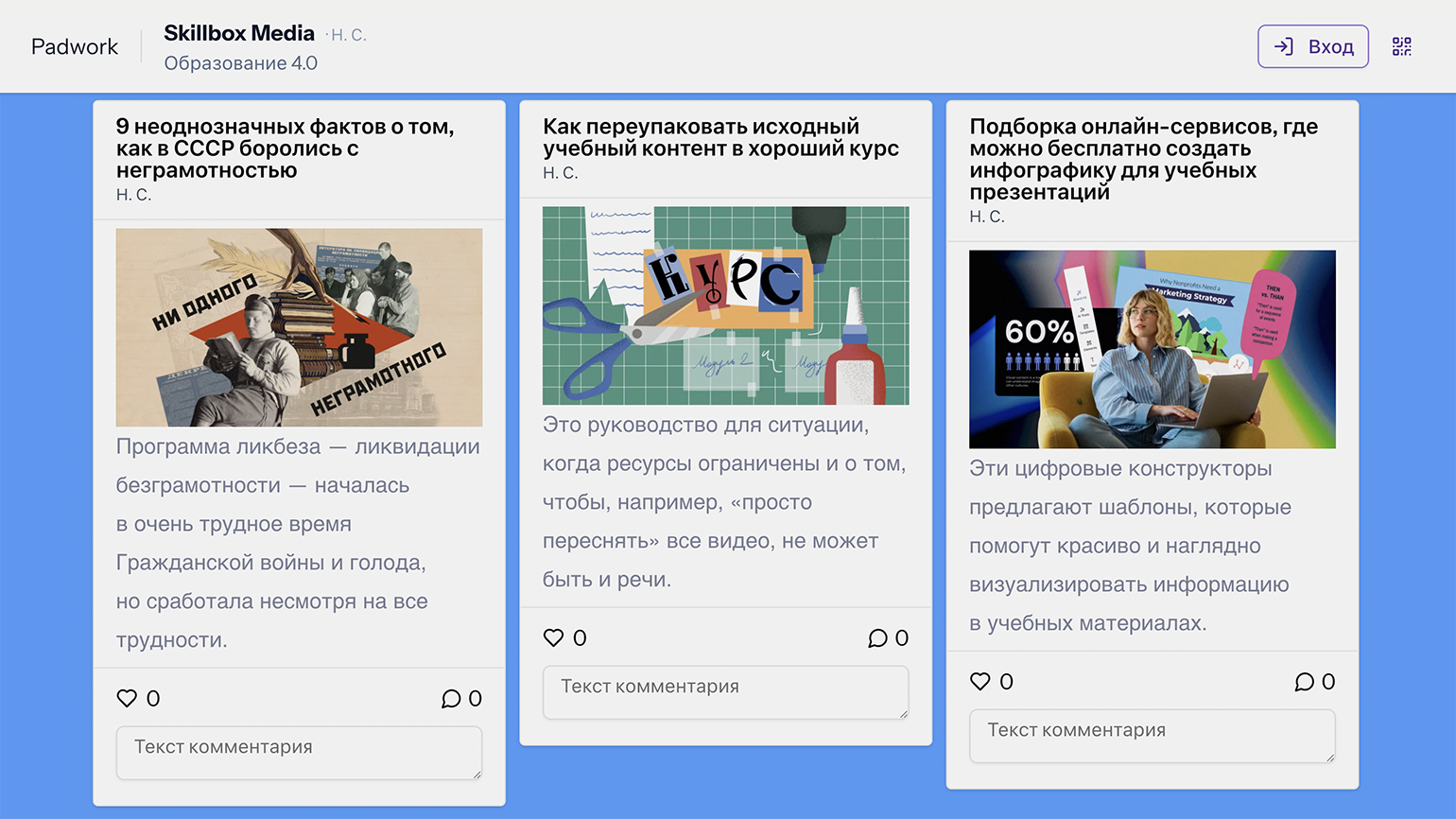 Это интерактивная доска для визуализации материала и совместного создания контента. В отличие от привычных онлайн-досок, на которых пользователи могут рисовать и размещать контентные блоки где угодно на неограниченном поле, Padwork структурирует содержимое с помощью карточек, зафиксированных в рабочем пространстве. Разработчики называют свой сервис аналогом суперпопулярного инструмента Padlet.