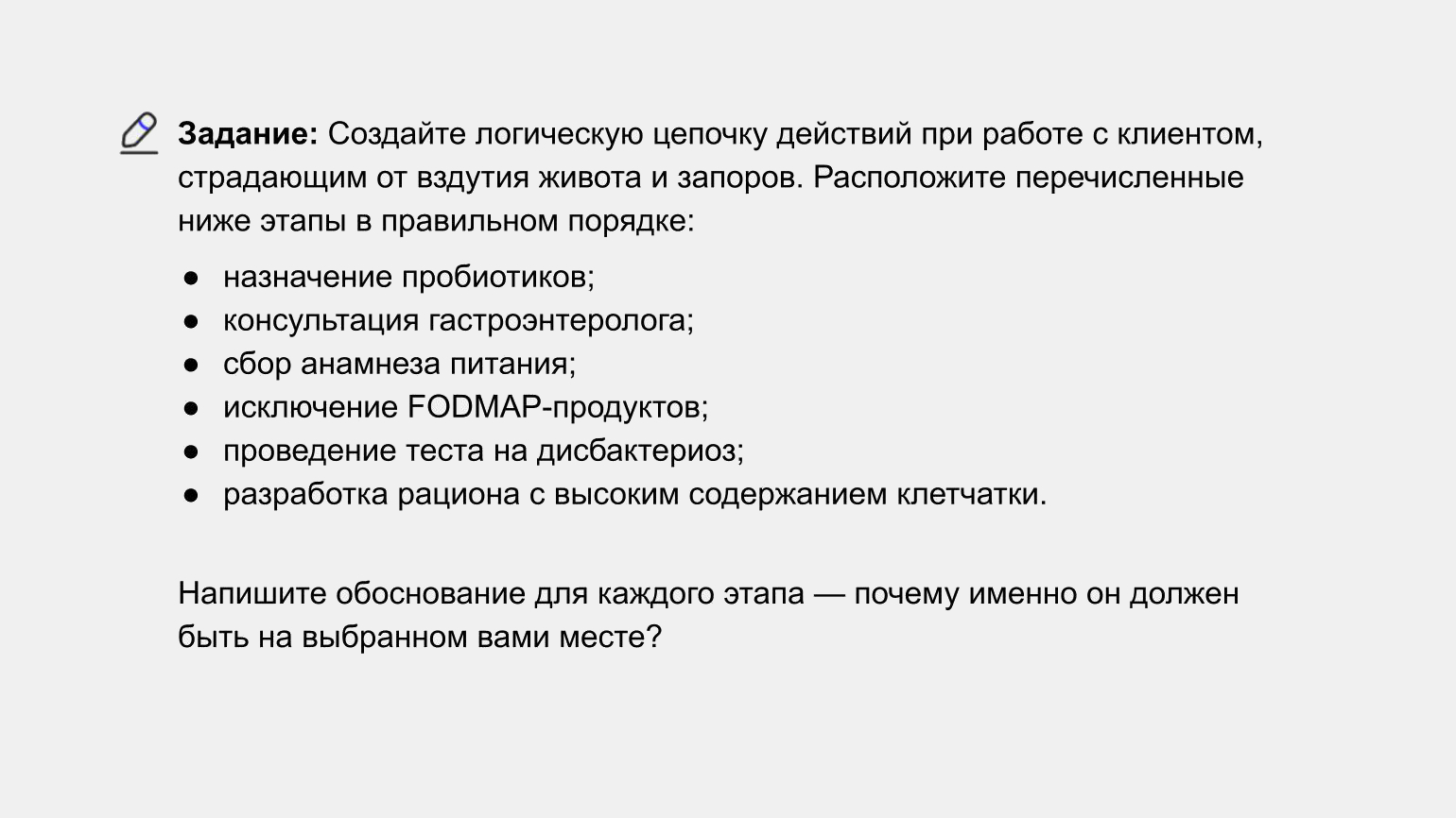 В курсе «Нутрициология» таким заданием стало создание чек-листа для первичной консультации клиентов. Составляя его, студенты обобщают и применяют знания о том, что включает в себя консультационная деятельность, и они не должны упустить ни одного важного этапа — от установления контакта и сбора анамнеза до анализа собранных данных и планирования дальнейших шагов.
