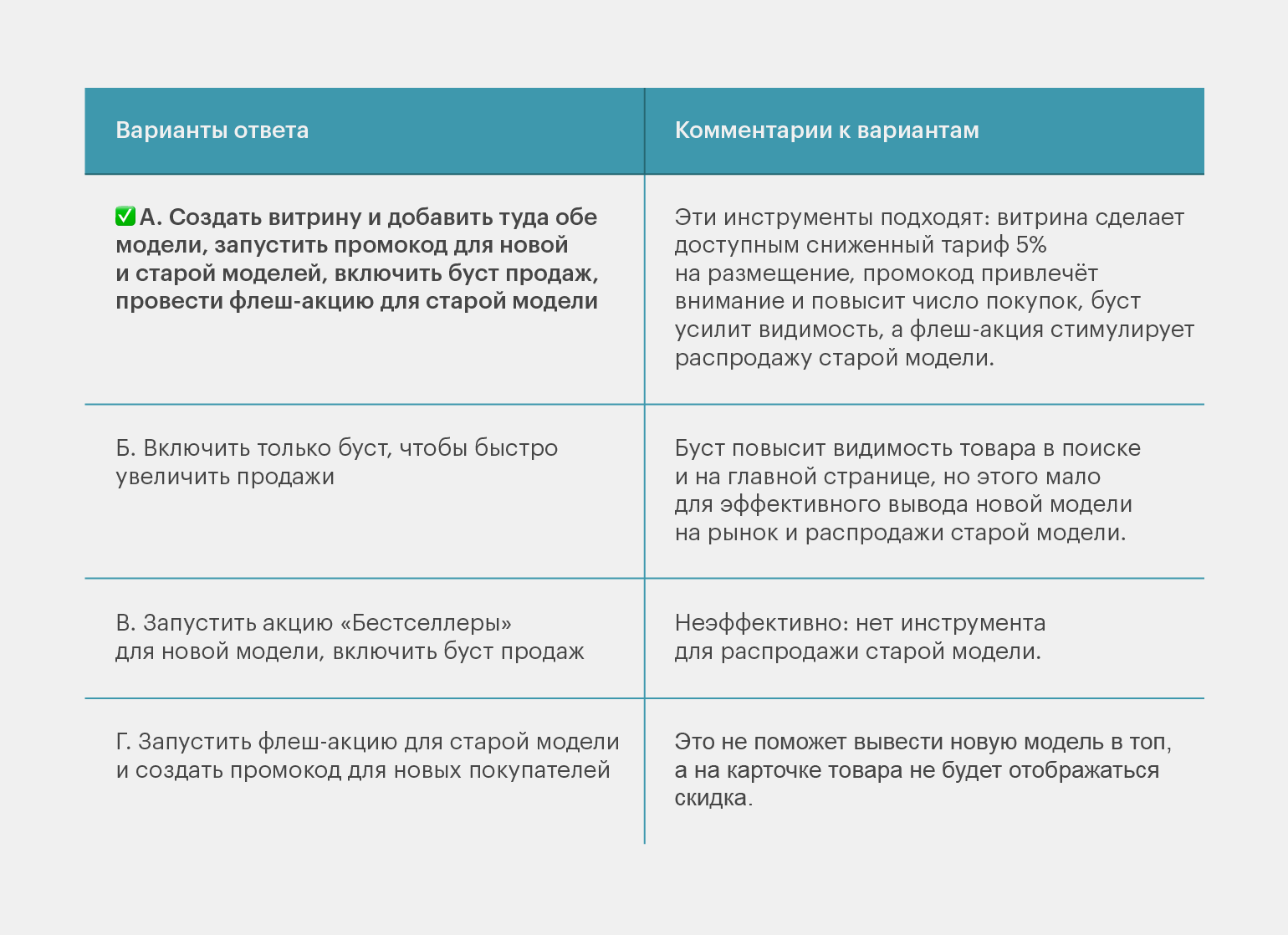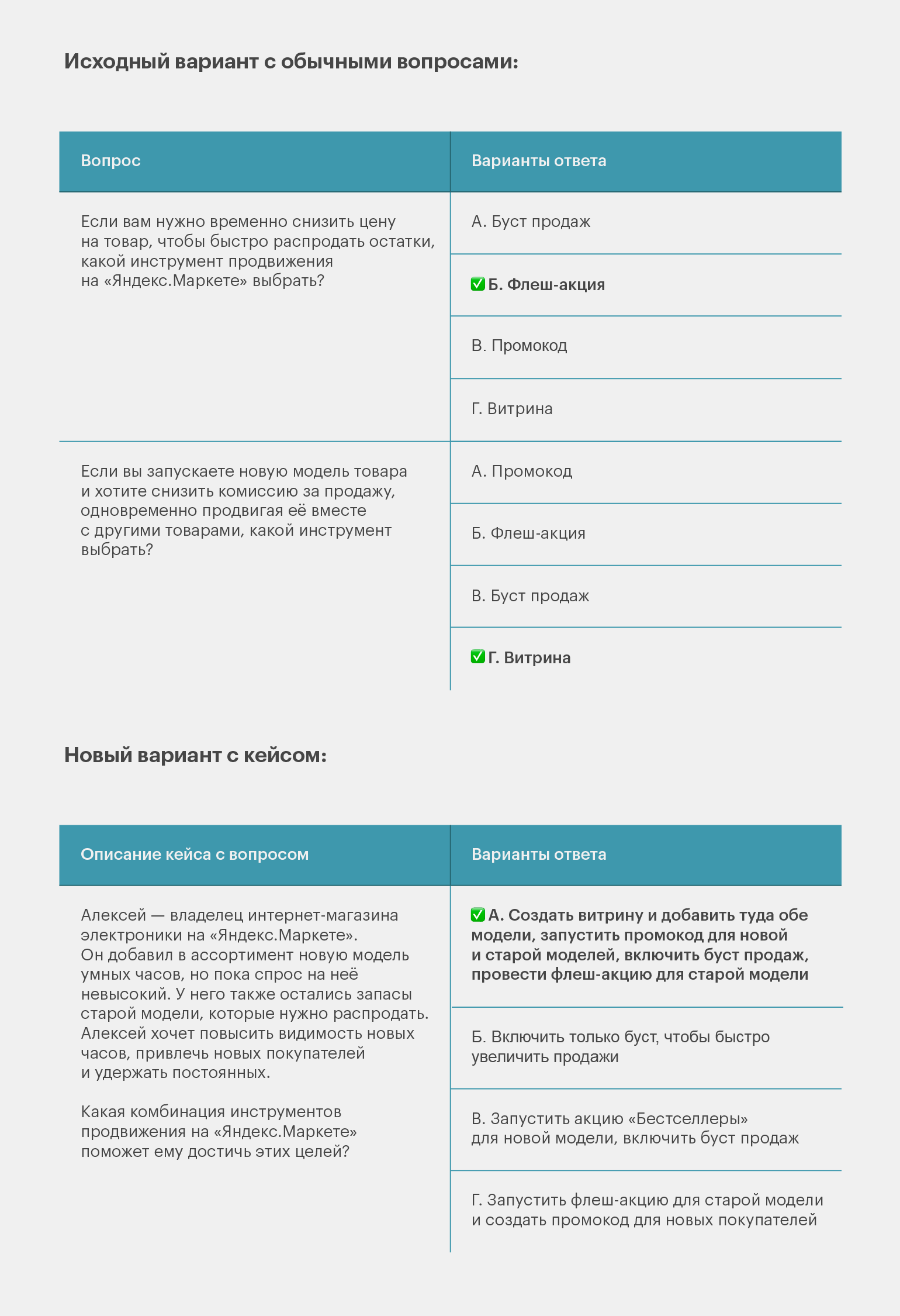 - Преобразуйте тестовые вопросы в кейсы. Кейсы позволяют моделировать реальные ситуации, развивать навыки анализа, принятия решений и критического мышления, что значительно повышает практическую ценность обучения. Например, для курса «Продвижение на „Яндекс Маркете“» мы превратили отдельные тестовые вопросы в один вопрос с описанием кейса.