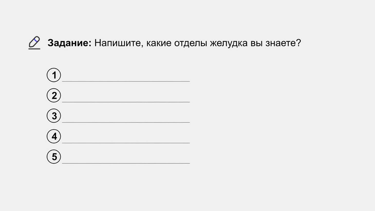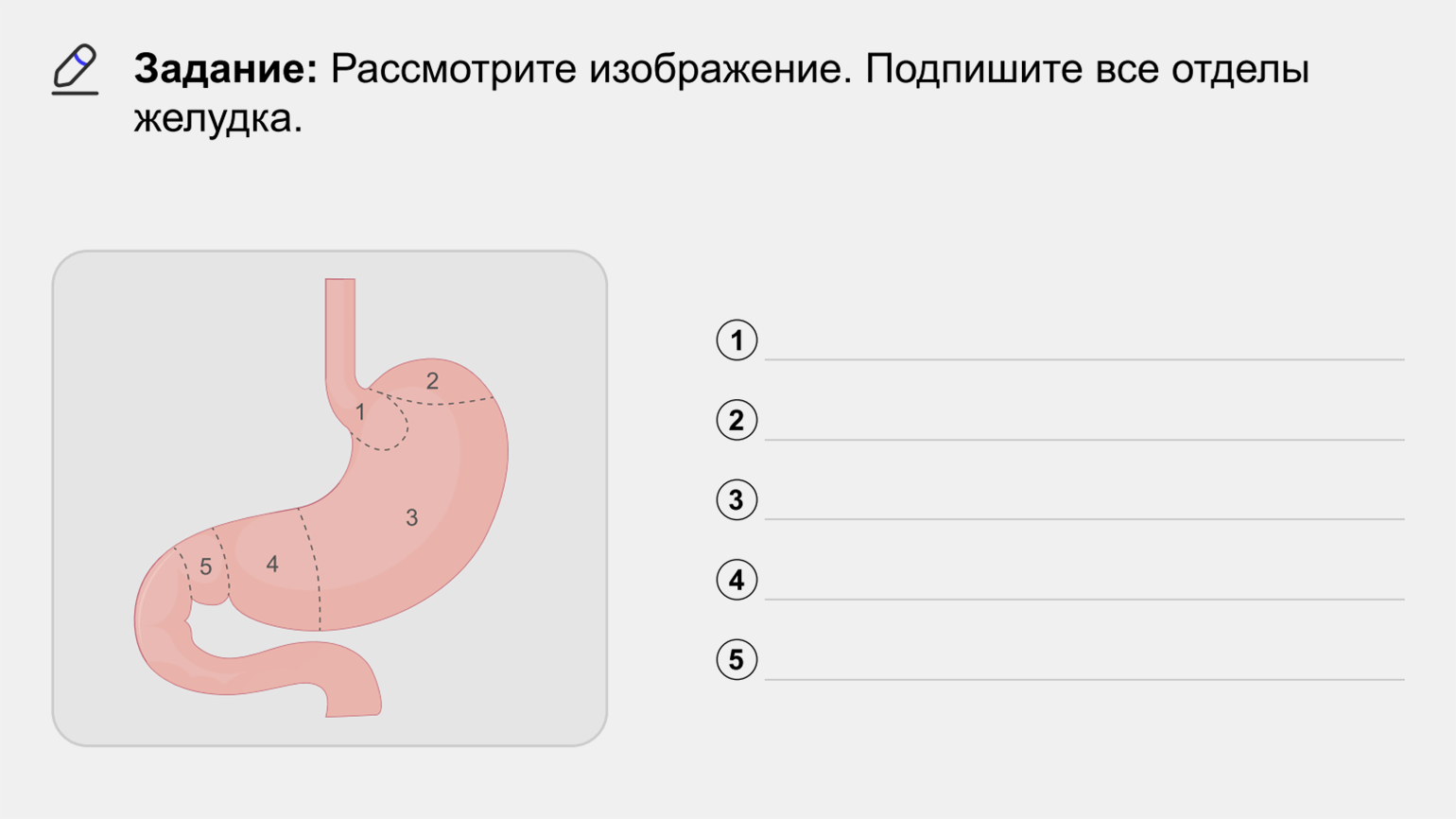 Если это возможно, то, знание чего нужно проверить, стоит визуализировать в виде картинки или схемы и предложить учащимся подписать её элементы. Такое задание имеет элемент интерактивности и более интересно для студентов. Пример задания: