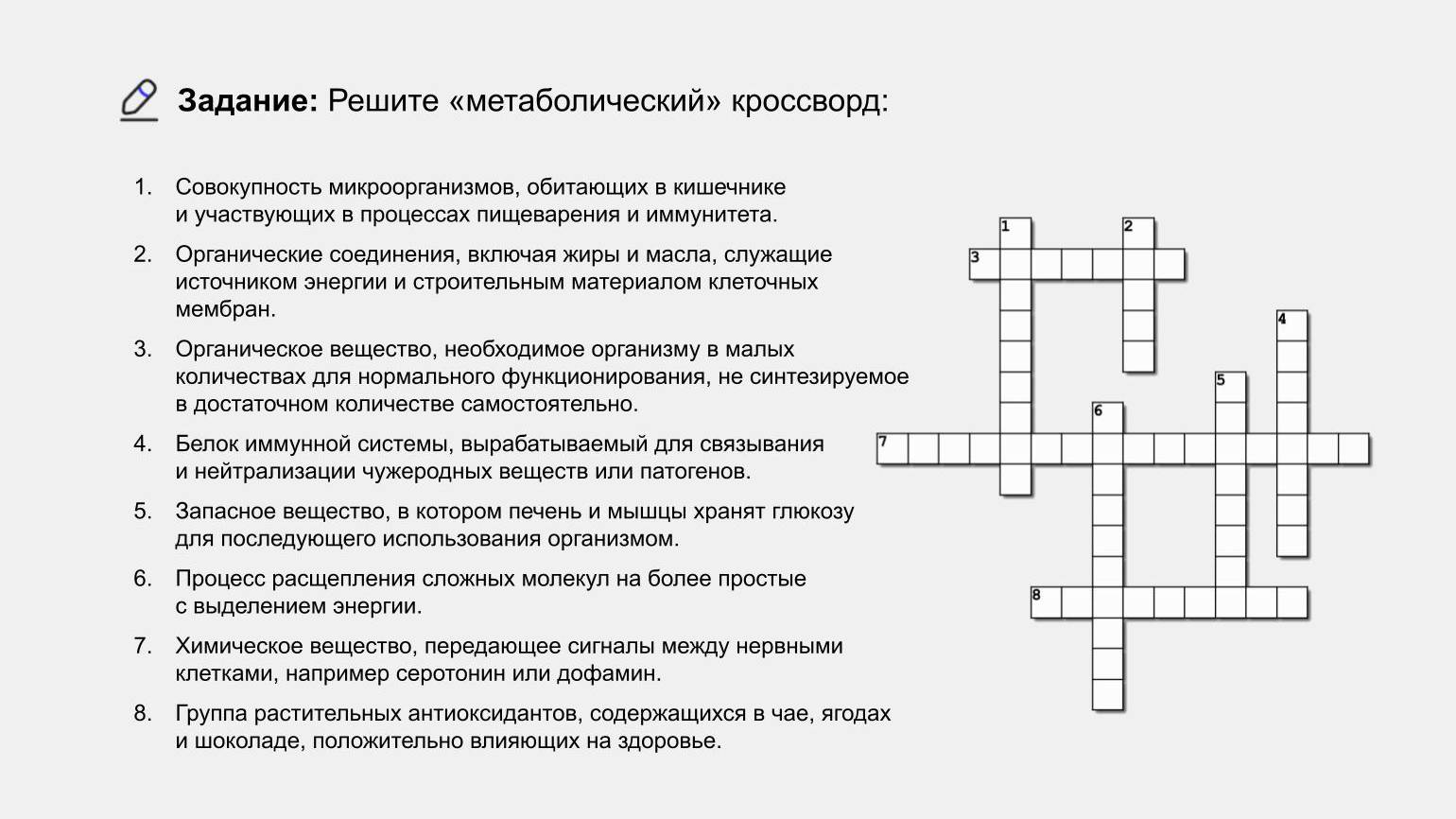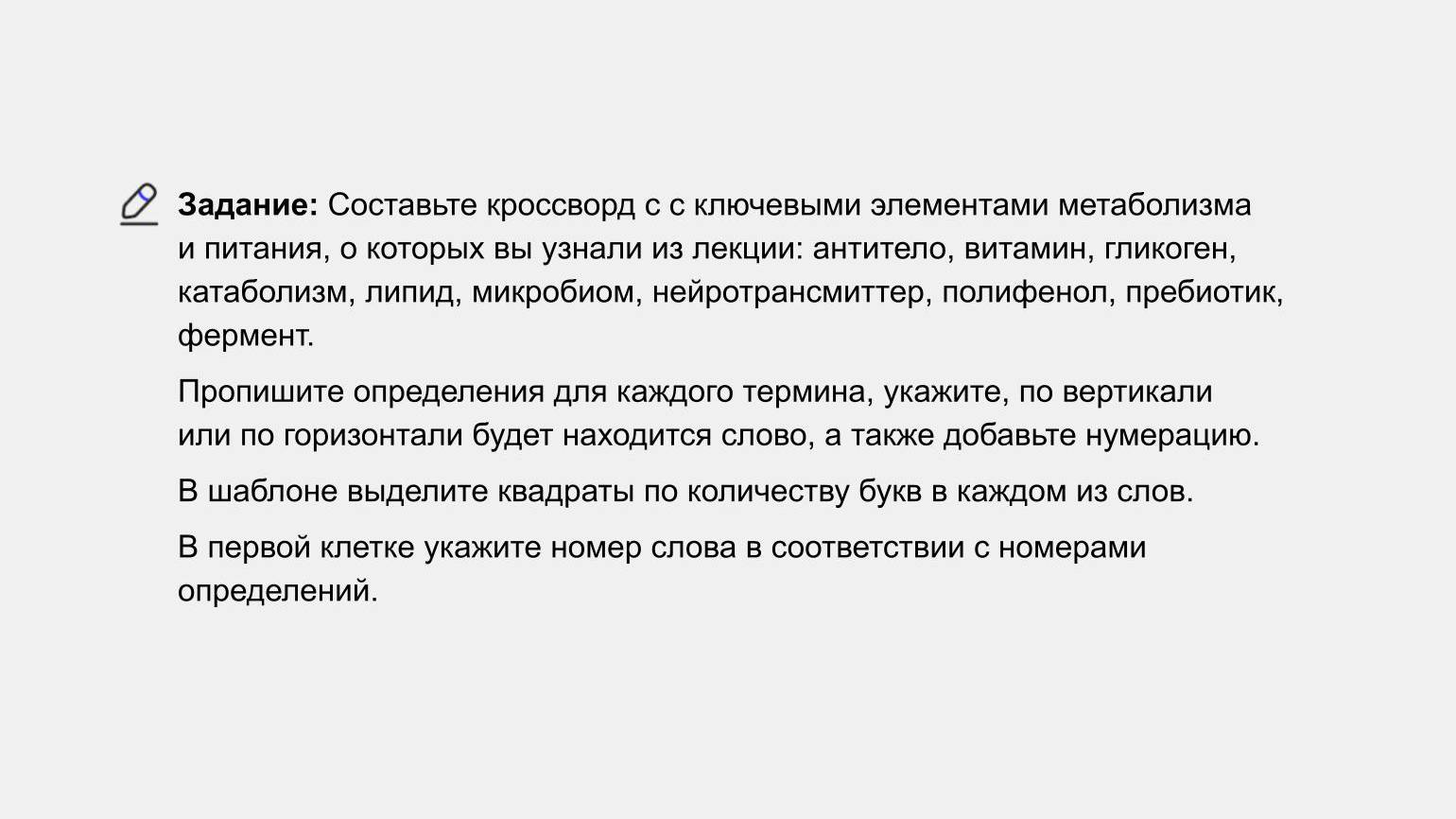 В отличие от решения кроссворда, где студенту нужно лишь вспомнить термины и их определения, для составления требуется глубоко проработать материал и структурировать его, чтобы подобрать точные определения, а также проявить креативность. Такое задание можно поручить студентам как индивидуально, так и в парах или небольших группах. Пример задания:
