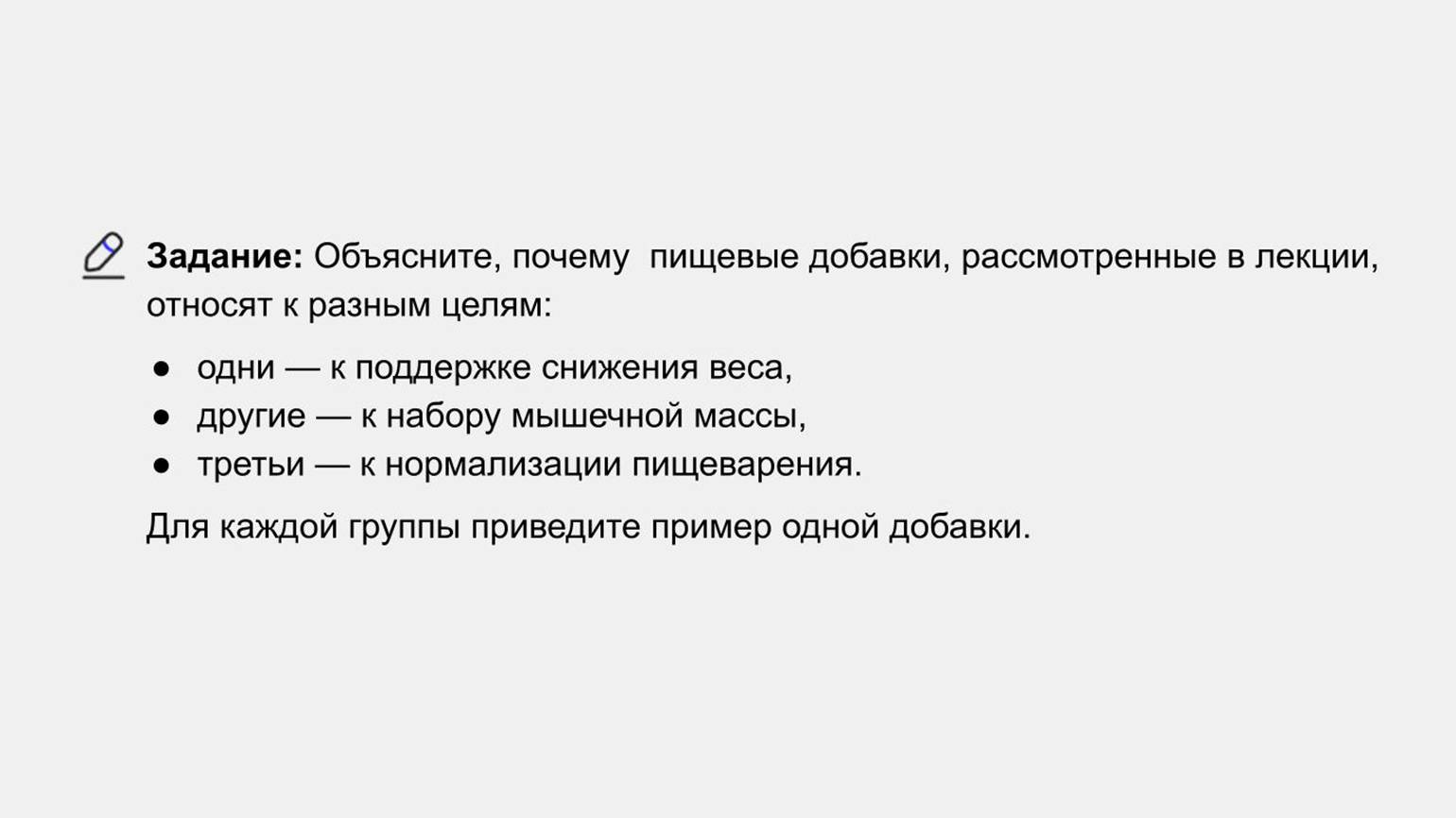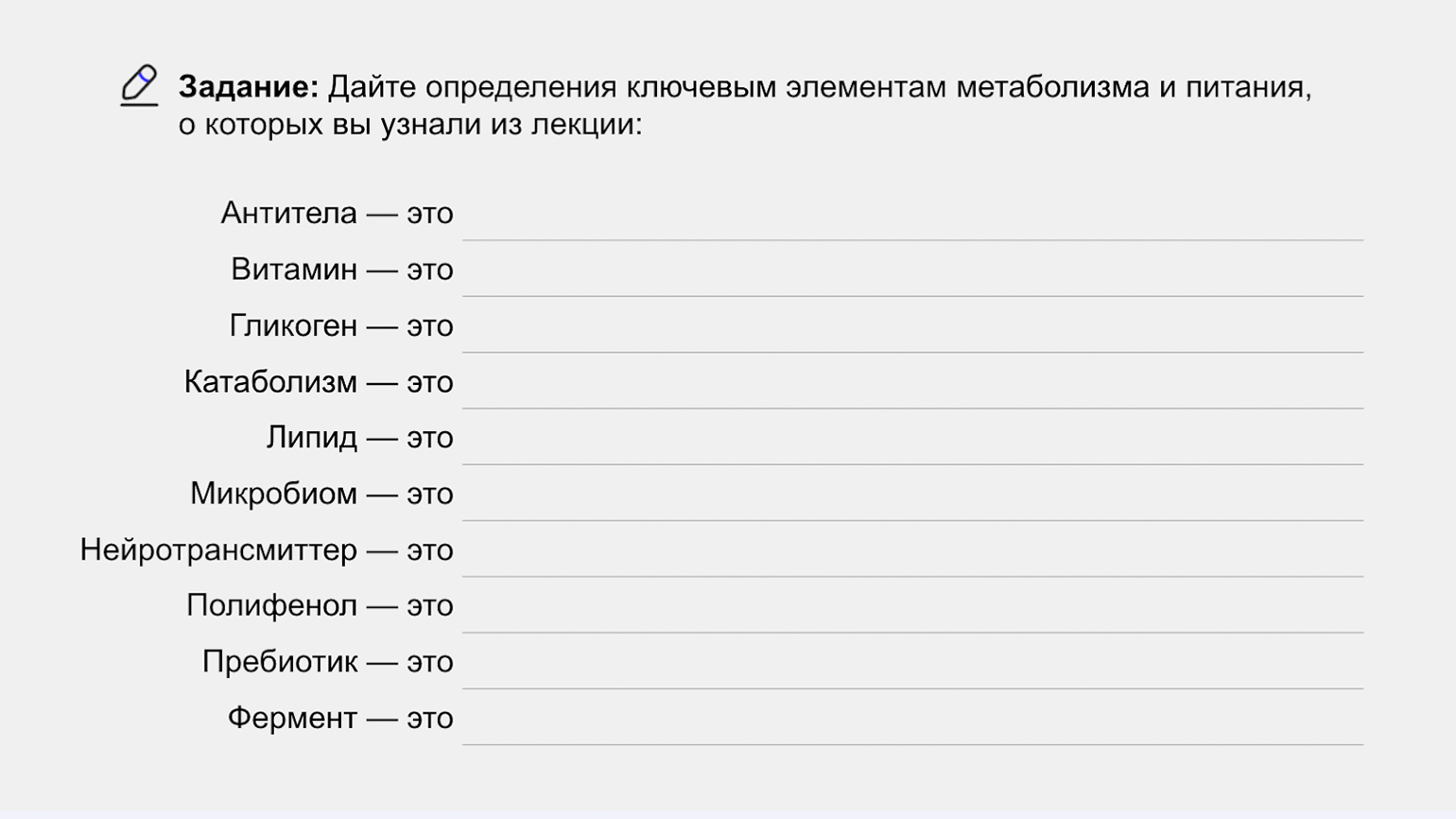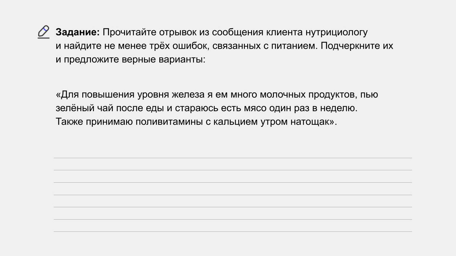 В курсе «Нутрициология» это задание выглядит как подготовка памятки для клиентов. Студентам нужно ясно и лаконично донести до неспециалистов информацию, которую они изучили ранее: с объяснениями «на пальцах» и понятными примерами. Тему они выбирают из предложенных вариантов — например, «Как повысить уровень железа без добавок» или «Правила приёма пробиотиков».