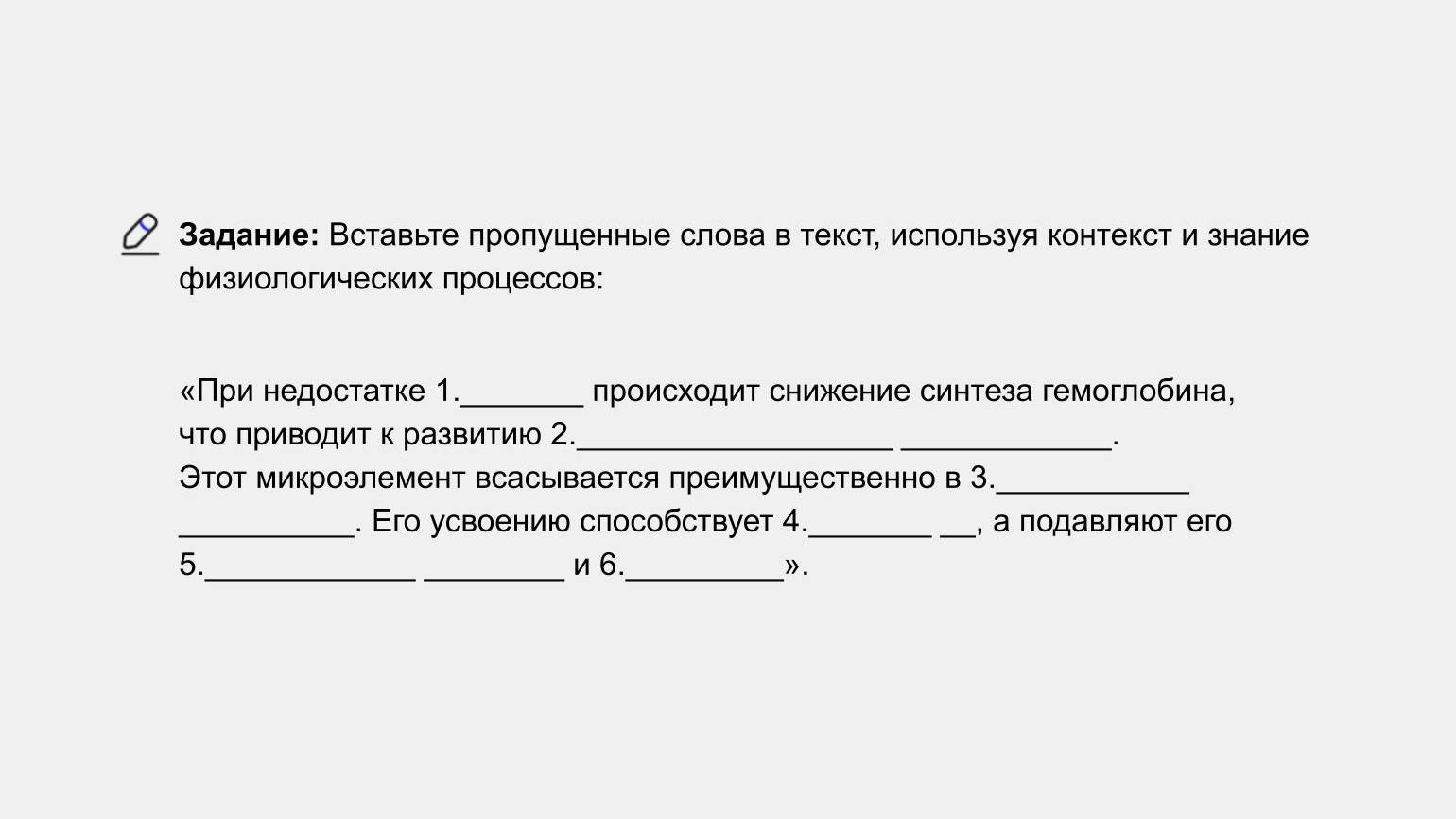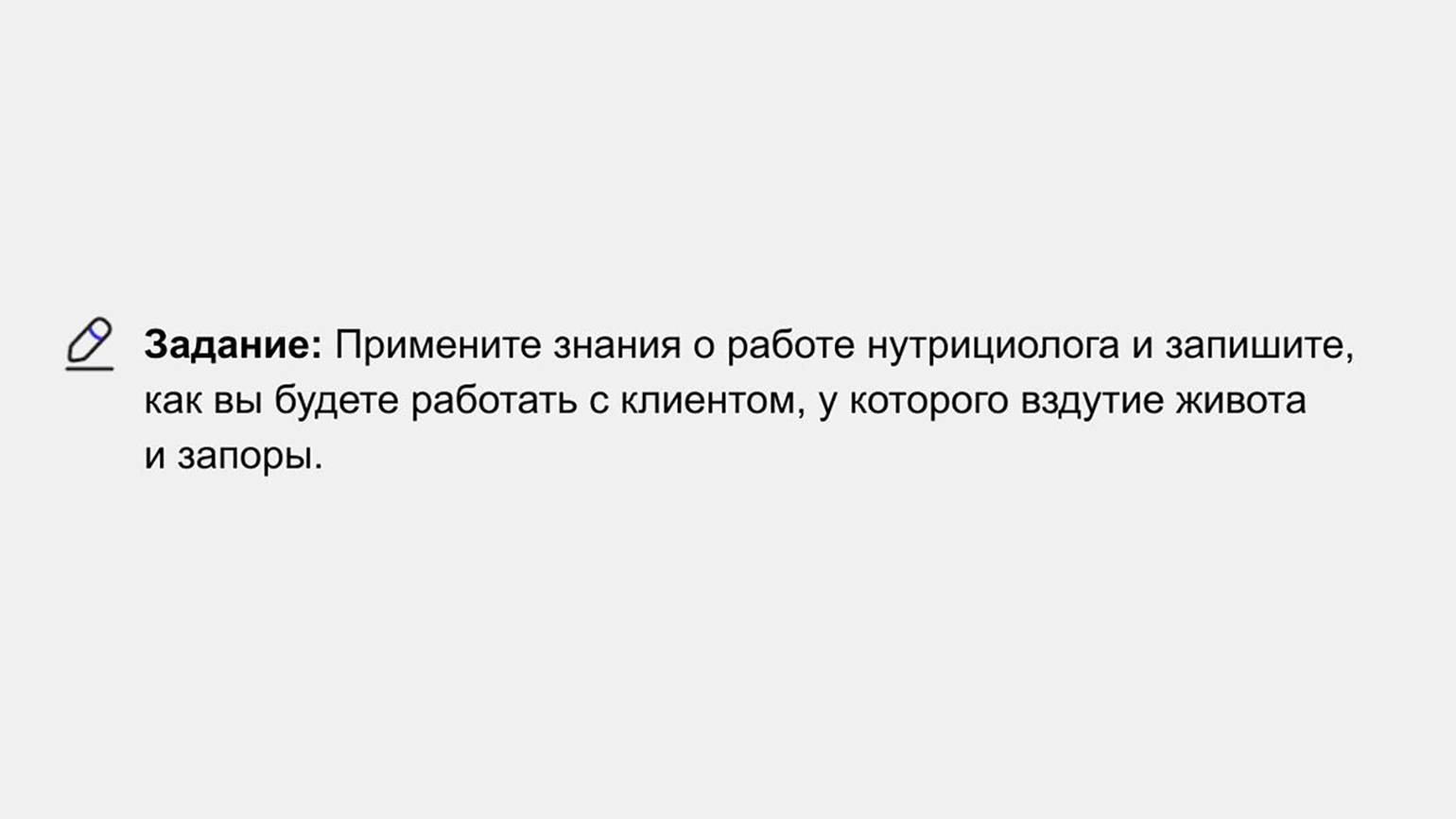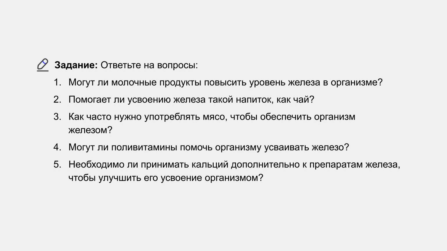 В курсе «Нутрициология» это задание выглядит как подготовка памятки для клиентов. Студентам нужно ясно и лаконично донести до неспециалистов информацию, которую они изучили ранее: с объяснениями «на пальцах» и понятными примерами. Тему они выбирают из предложенных вариантов — например, «Как повысить уровень железа без добавок» или «Правила приёма пробиотиков».