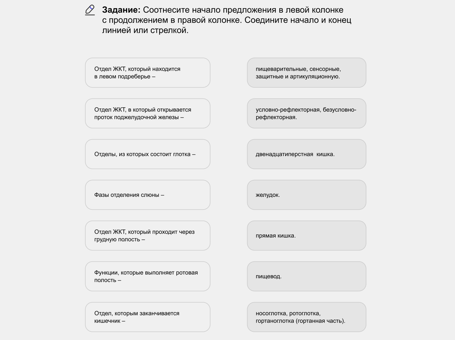 Ещё один способ систематизации новых знаний для лучшего их понимания и усвоения — это сопоставление. Для этого дайте задание, в котором студентам нужно будет правильно соединить элементы друг с другом стрелками или линиями, тем самым выстроив логическую связь. Конечно, это возможно при условии, что конструктор, в котором вы обновляете курс, поддерживает такую механику либо позволяет встраивать контент из внешних источников. Пример задания: