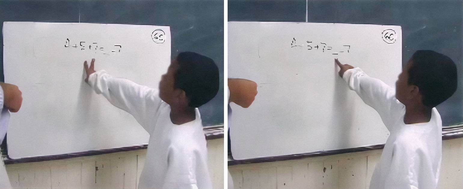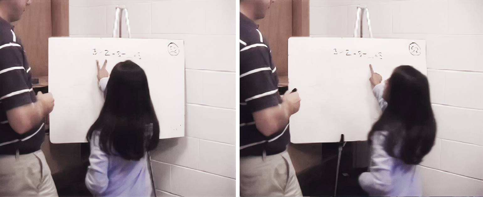 Ключевая гипотеза была в том, что если научить детей указывать двумя пальцами одной руки (то есть указательный и средний палец составляют букву «V») на два числа, которые нужно сложить для решения, а указательным пальцем другой руки — на пустое место во второй части равенства, то дети легче освоят стратегию группировки чисел, а она будет им полезна и при решении других задач.