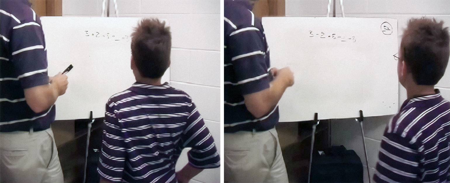 При чём тут жесты? Участников делили на три группы. Одну инструктировали объяснять свои решения как можно сосредоточеннее, не делая лишних движений руками. Второй группе, наоборот, сообщили, что сфокусироваться помогает как раз движение и они должны вращать кистями рук (что на самом деле, конечно, не несло никакого смысла). Третьим посоветовали просто использовать в процессе объяснения любые удобные им жесты. В основном участники этой группы просто указывали на те части уравнения, о которых в каждый момент говорили.