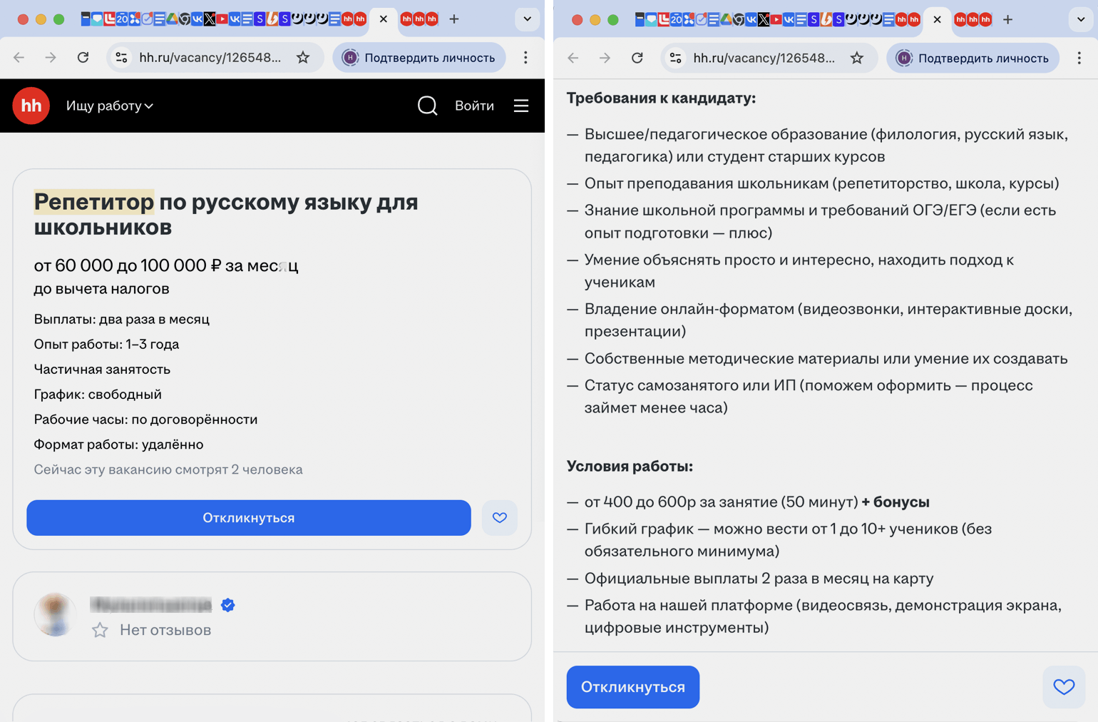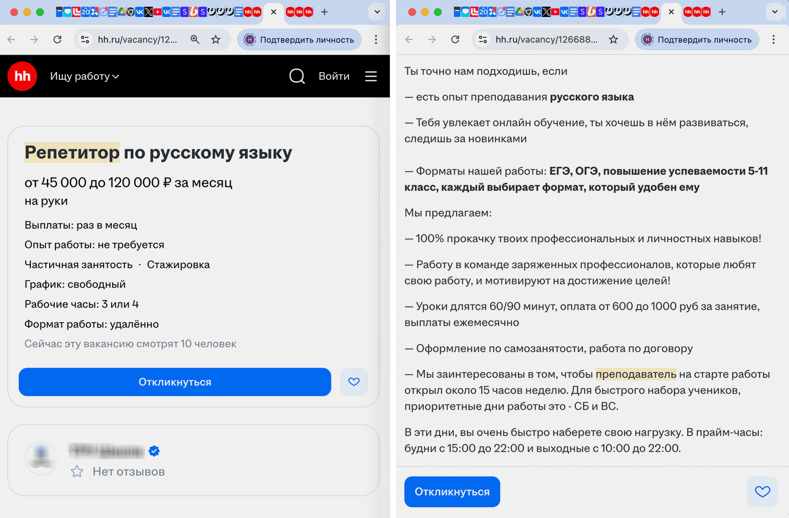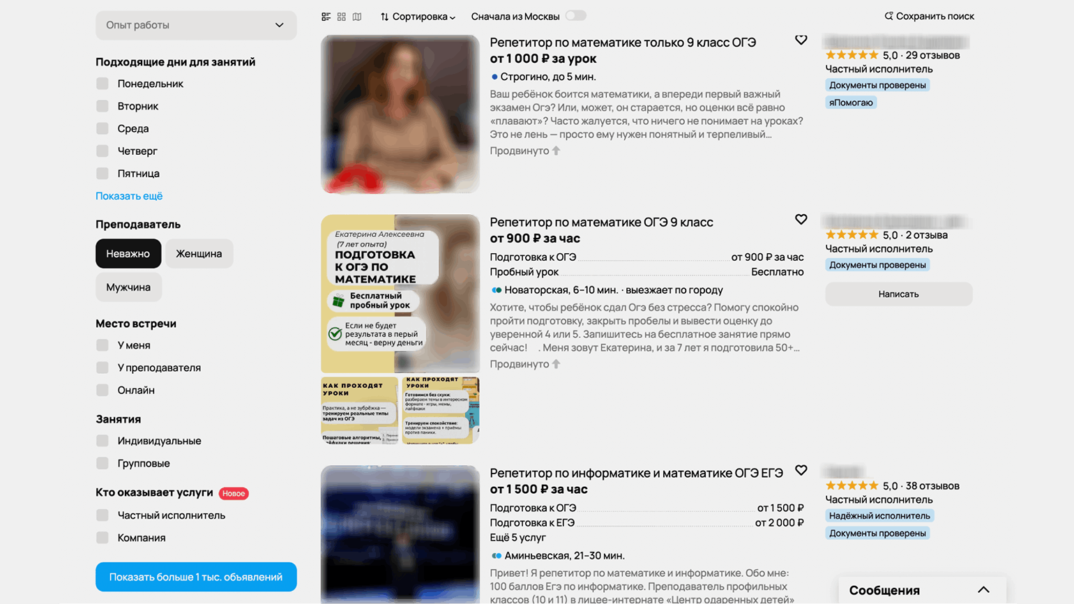 У школьного учителя английского и репетитора Марии противоположный опыт: «На „Авито“, по-моему, вообще происходит непонятно что: десятки вакансий от онлайн-школ, написанных под копирку, которые обещают уроки за 300 рублей, платят за рекламу и выходят в топ; „учителя“, достижения и опыт которых — это буквально „сдала ОГЭ на пять“, и ценник гораздо ниже того, что готова поставить я. Успеха на „Авито“ я не получила, только попрощалась со своими нервными клетками».