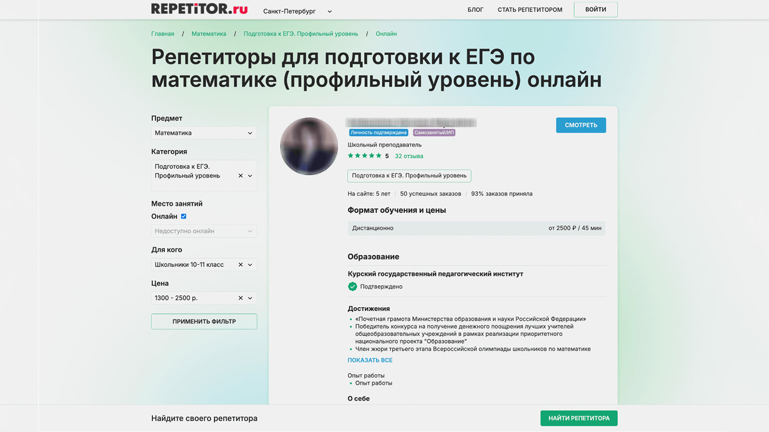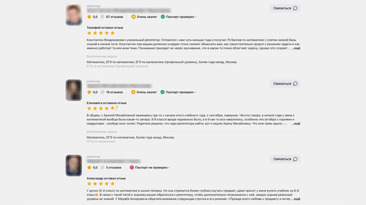 К примеру, у Анастасии Иноземцевой есть профиль на «Репетитор.ру» и «Профи.ру», но с первой площадки, по её словам, к ней пришли всего четыре ученика за четыре года, а со второй — один. «Непонятно, как развиваться на платформе, если отзывы могут оставить только те, кто пришли ко мне заниматься через конкретный сайт. Это нужно годами репутацию подпитывать отзывами, оплачивать отклики, что много денег требует, и, наверное, начинать с невероятно низких цен», — предполагает она.
