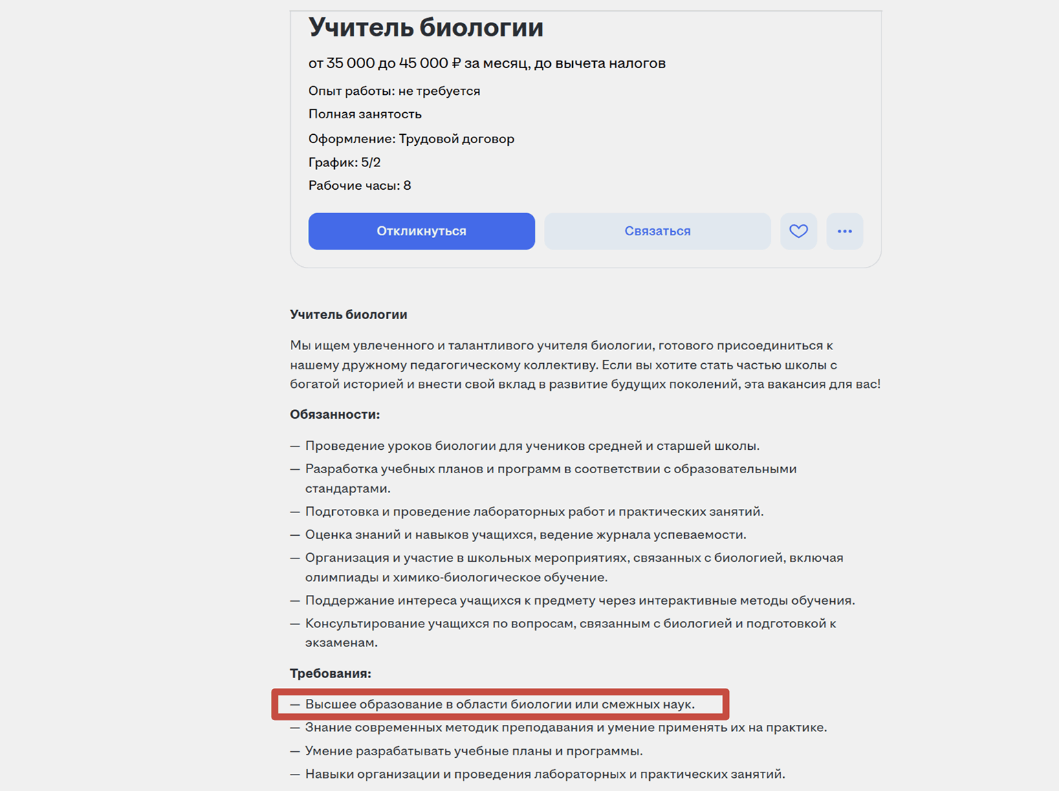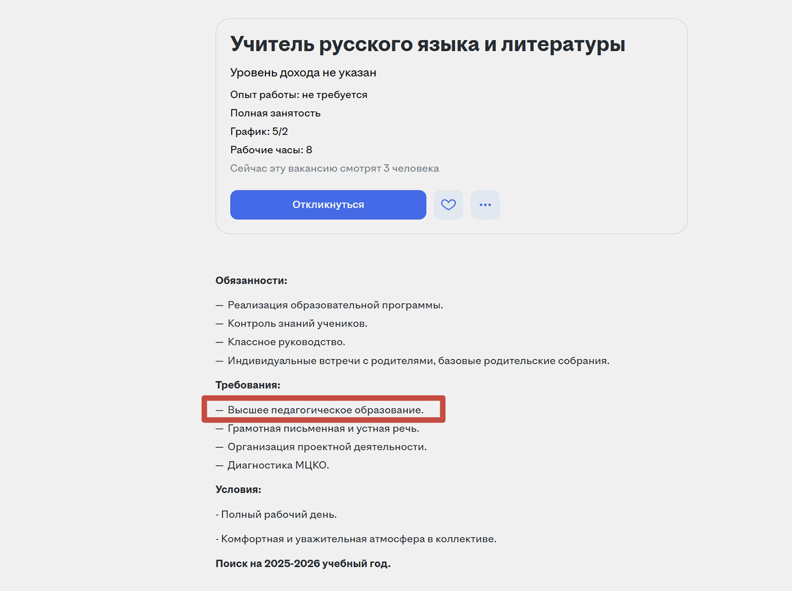 В реальных вакансиях требования к образованию кандидатов формулируют по-разному. В школах, которые считаются престижными, особенно расположенных в регионах, где нет острого дефицита учителей (например, в Москве), как правило, хотят видеть учителей с высшим профильным образованием (педагогическим или в предметной области), а в других будут рады учителям с любым допустимым по закону образованием — и со средним профессиональным, и после курсов.