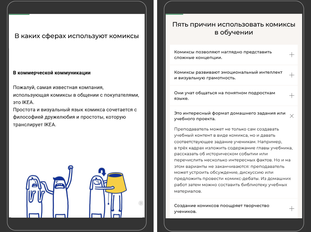 Во-первых, к структуре учебного лонгрида надо подходить как к сценарию любого занятия: выделить разделы по смыслу, чередовать блоки с разными типами деятельности (например, «сканирование» контента, чтение, рассматривание, взаимодействие), поддерживать внутреннюю логику повествования, подытоживать изученное в конце. Чтобы облегчить восприятие информации и поддержать мотивацию учащихся, важно включить в лонгрид не только «теоретические» и «практические» блоки, но и «мотивационные» — объяснения, как новые знания связаны с уже изученными, примеры из реальной жизни и опыта читателей. Также будут полезны инструменты сторителлинга.
