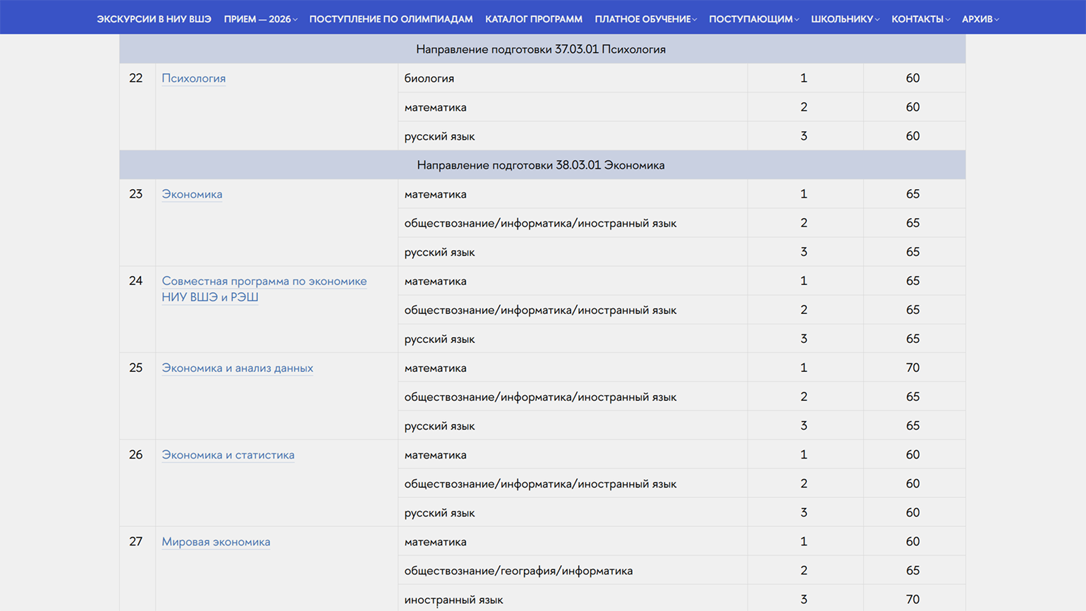 Пример необходимых предметов из перечня для поступления в ВШЭ в 2026 году