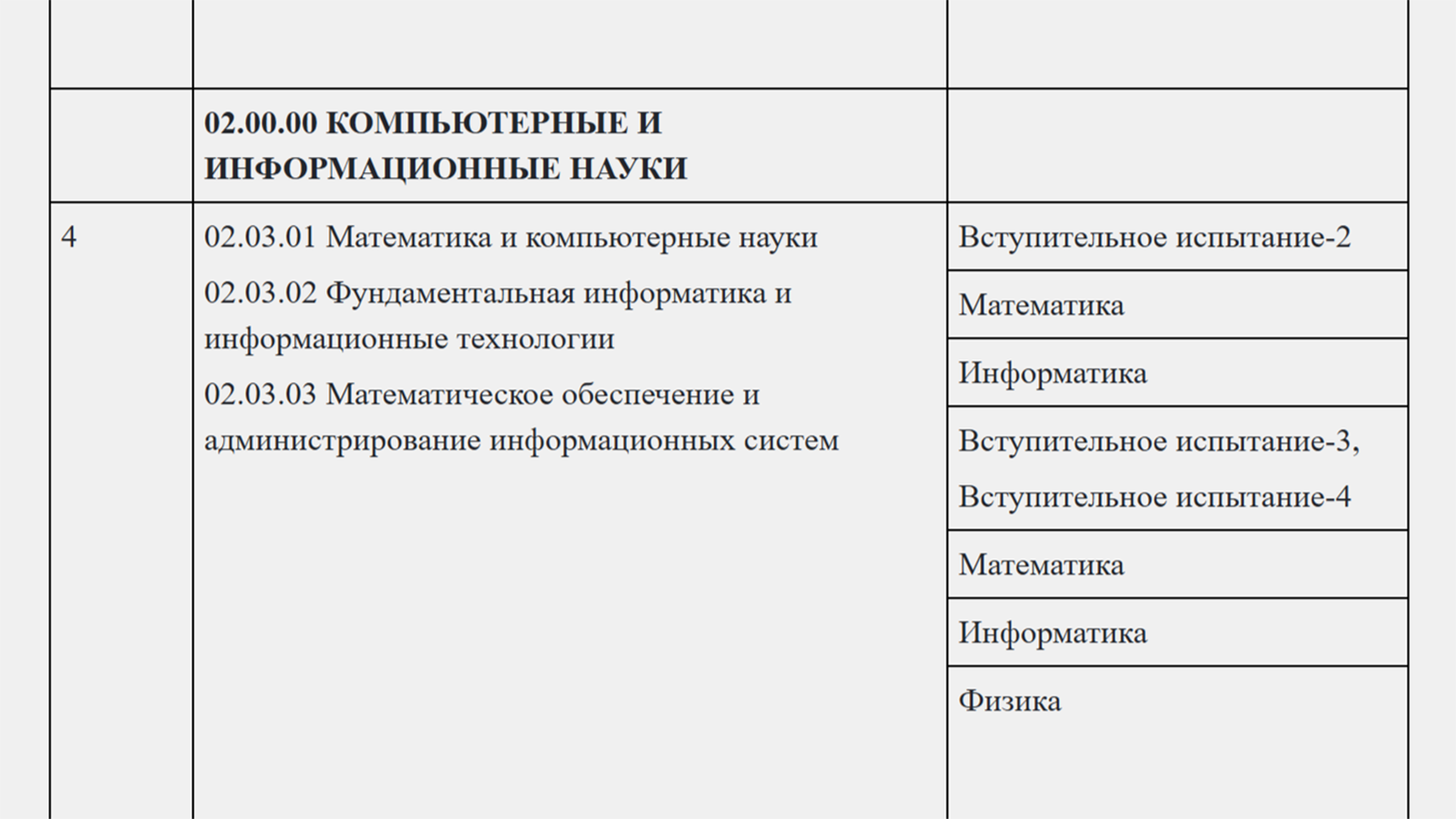 Вот, например, как выглядит в Перечне, утверждённом Минобрнауки, набор предметов (помимо обязательного русского языка), которые вузы могут установить для приёма на группу направлений подготовки, связанных с компьютерными науками: