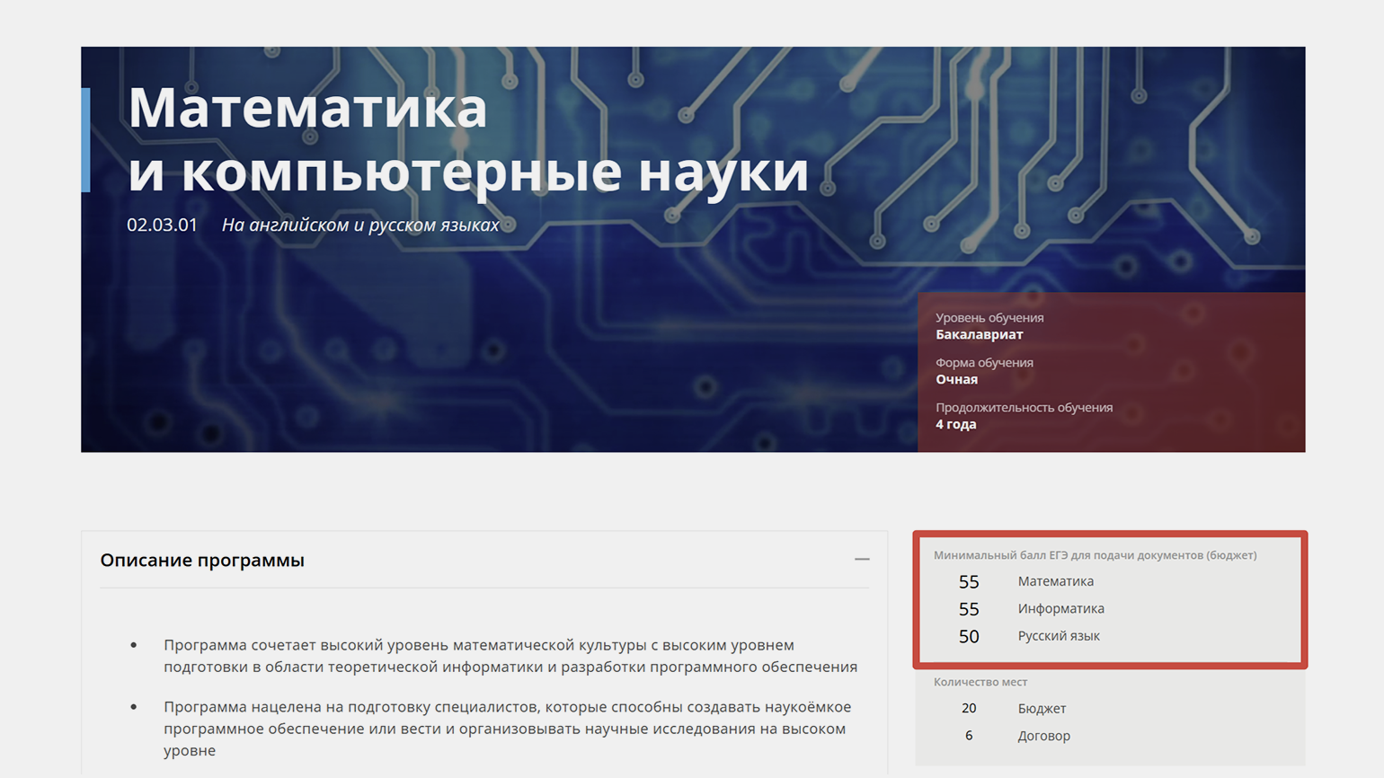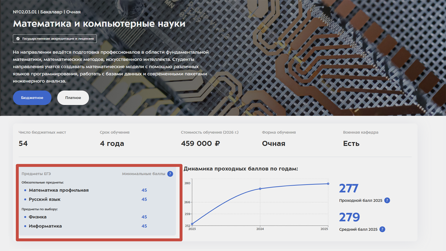 Для сравнения: в СПбГУ на таком же направлении у абитуриентов нет выбора — надо предъявить профильную математику и информатику, а физика не требуется, и даже если сдать её по своему желанию, предъявить результат для поступления на это направление будет нельзя.