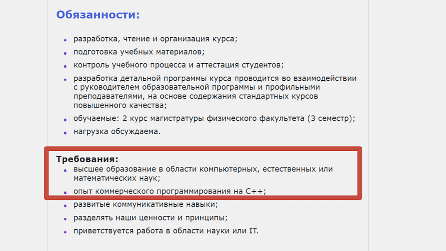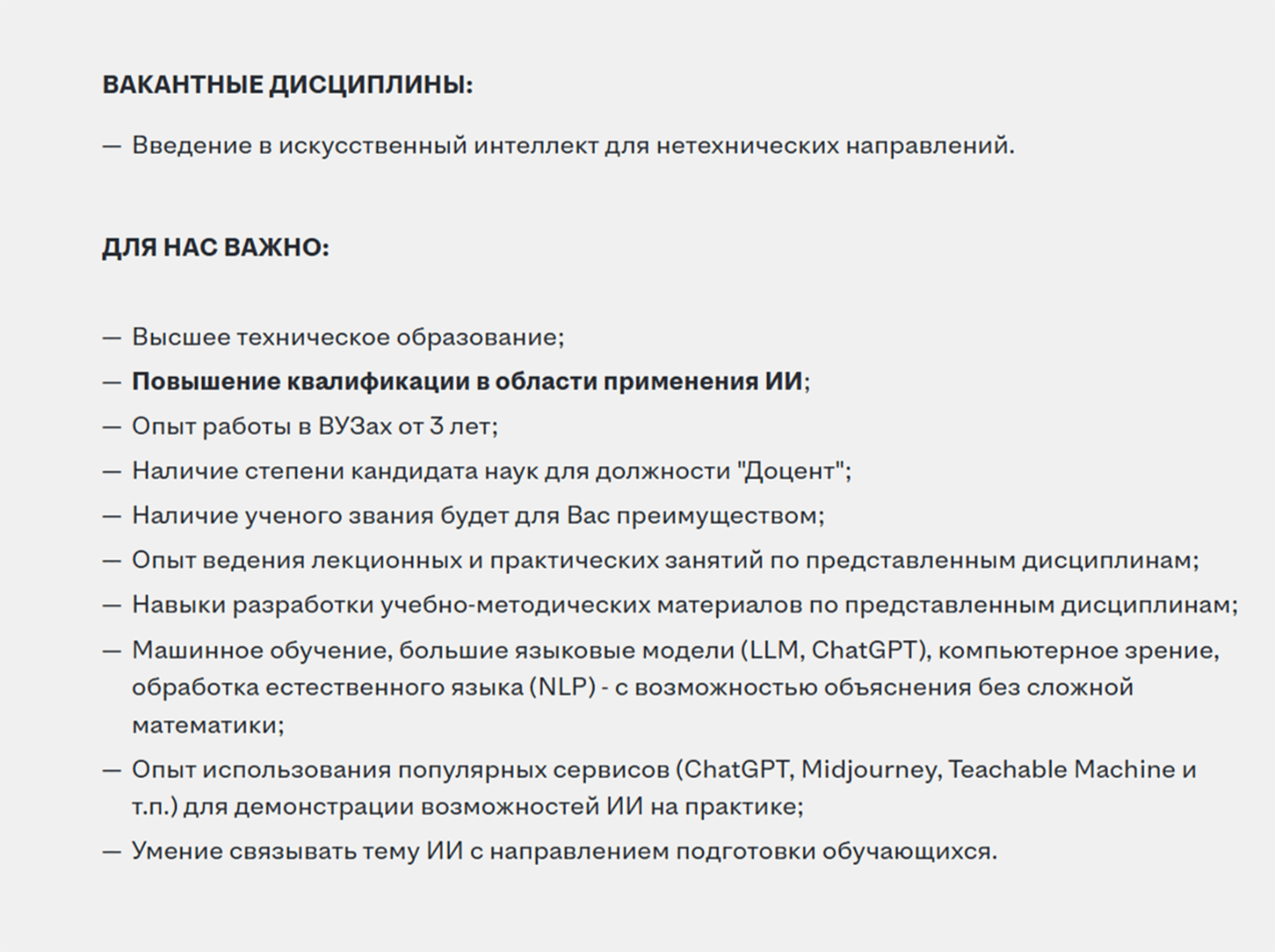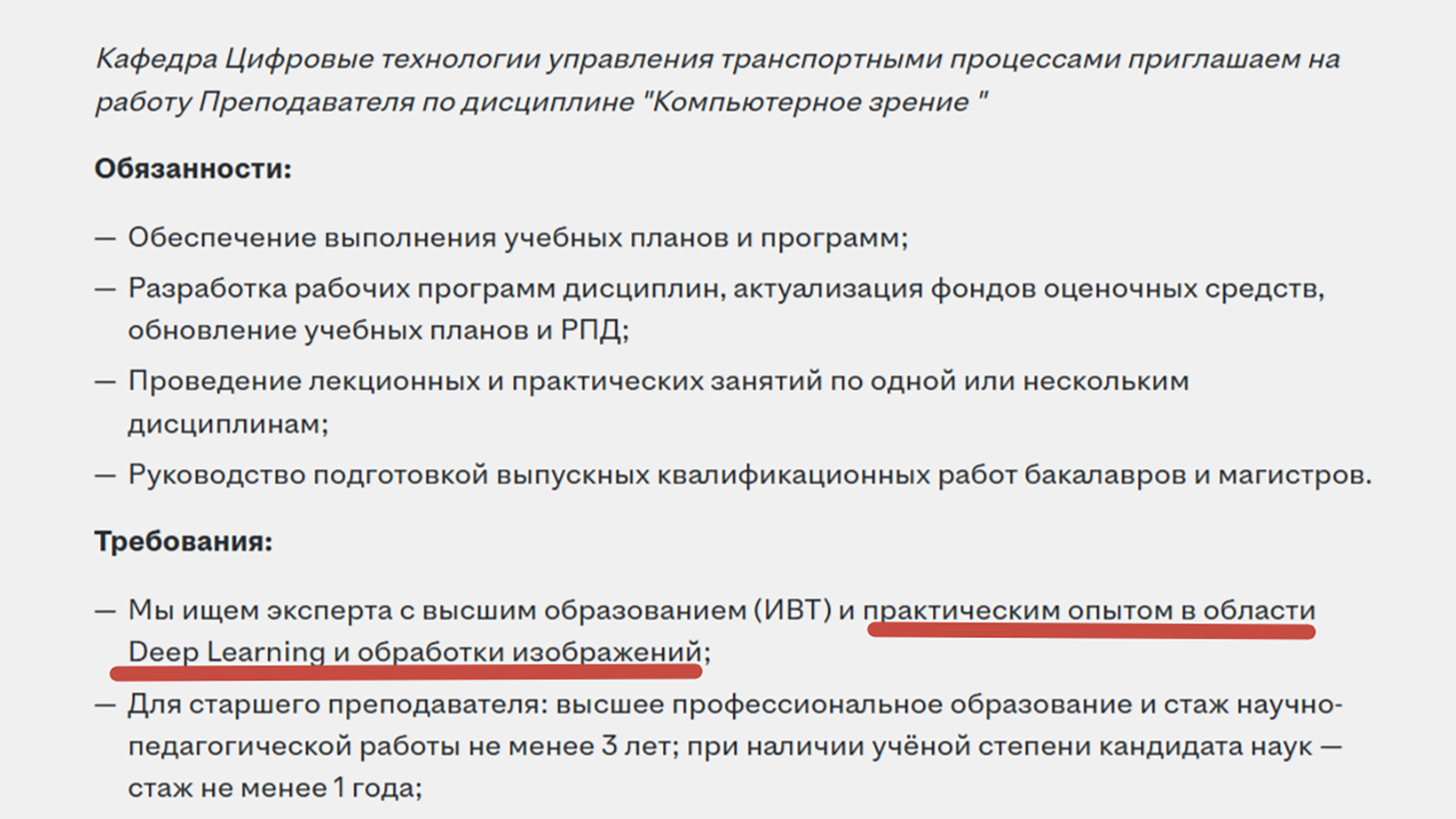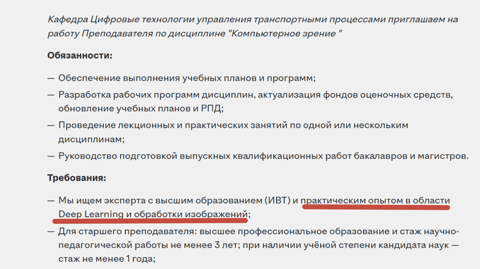 Во-вторых, сейчас университеты нуждаются не только в преподавателях, занимающихся наукой, но и в преподавателях из практической среды — например, чтобы программирование преподавали те, кто и сам работает в IT-компаниях, маркетинг — маркетологи-практики. В этих случаях для преподавания не требуется учёная степень и педагогический опыт — важнее профессиональные знания и навыки эксперта в той предметной области, которую надо преподавать (то есть опыт в индустрии). Поэтому в таких случаях вузы охотно рассматривают кандидатов не из своей академической среды либо ждут кандидатов с опытом как в академической среде, так и в практической индустрии.