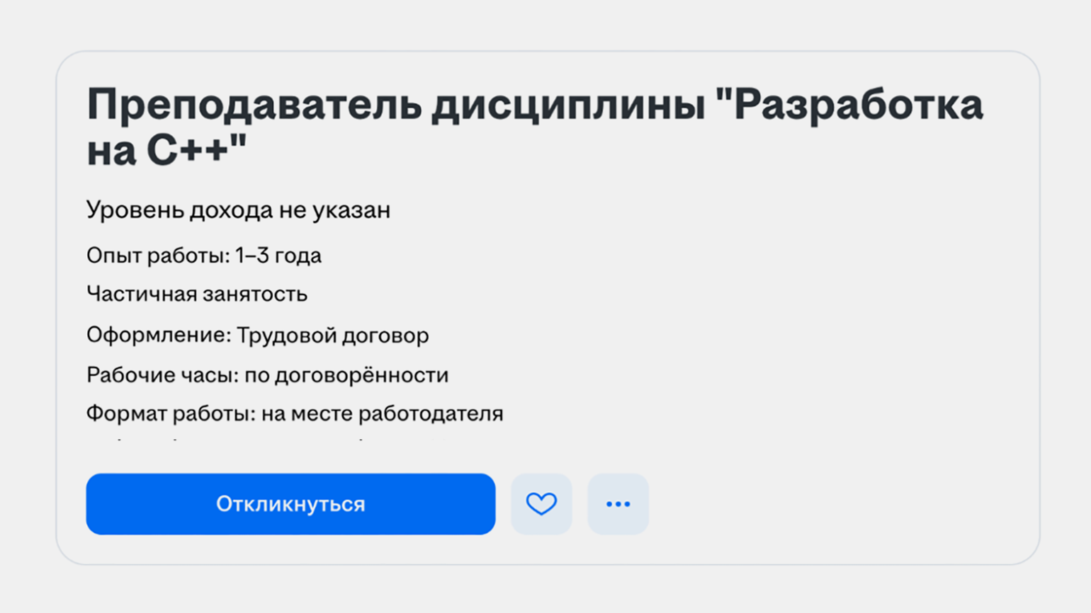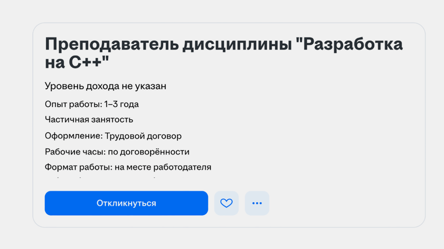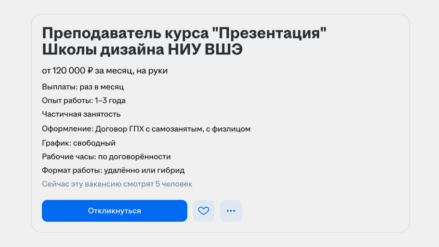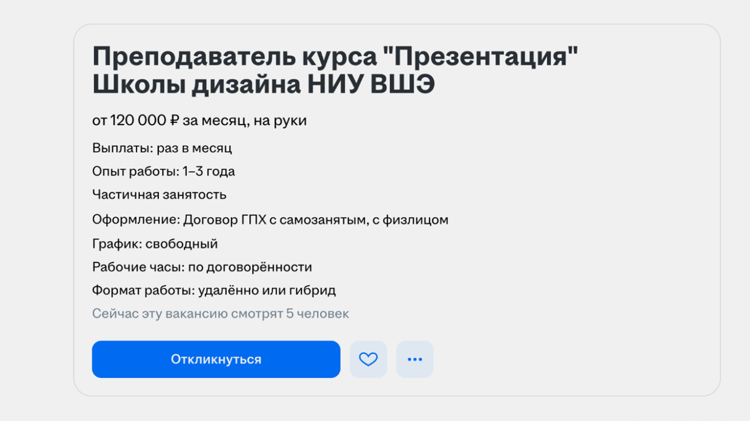 Условия работы таких преподавателей-практиков тоже могут отличаться от того, как работают штатные: например, у них может быть частичная занятость всего несколько часов в неделю, возможность самостоятельно определять свой график, а также упрощённый порядок трудоустройства без конкурсных процедур, например по договору об оказании услуг. Стоит учитывать, однако, что такое внештатное преподавание — это не столько самостоятельная профессия, сколько дополнение к развитию в своей основной карьере.