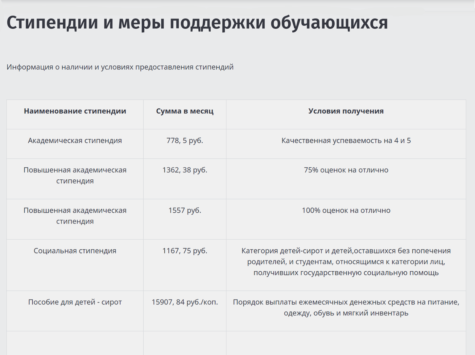 Чаще всего в 2025 году размеры социальных стипендий в колледжах варьируют от 1000 до 2000 рублей в месяц. Хотя бывают исключения как в меньшую, так и в большую сторону: так, например, в Театральном художественно-техническом колледже Москвы социальная стипендия в 2025 году составляет 2800 рублей.