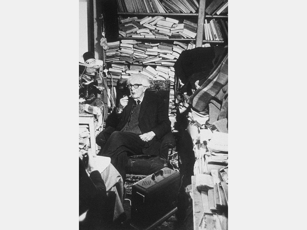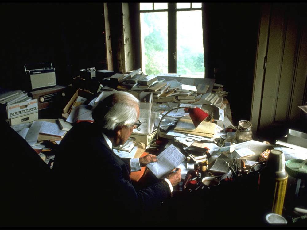 - Завалы книг и бумаг в кабинете Жана Пиаже стали частью его личного образа. Ещё в 1969 году журналист Жан-Клод Брингье осторожно назвал его рабочее пространство «беспорядочным», на что Пиаже мгновенно парировал: «Бергсон доказал, что беспорядка не существует. Есть геометрический порядок и есть живой. Мой — живой». Исследователи, изучавшие архивную фотографию его кабинета, подтверждают: хаос был только внешним. На деле же стопки и «острова» книг образовывали продуманную систему, отражавшую ход мыслей Пиаже — своеобразную материальную карту его интеллектуальной работы.