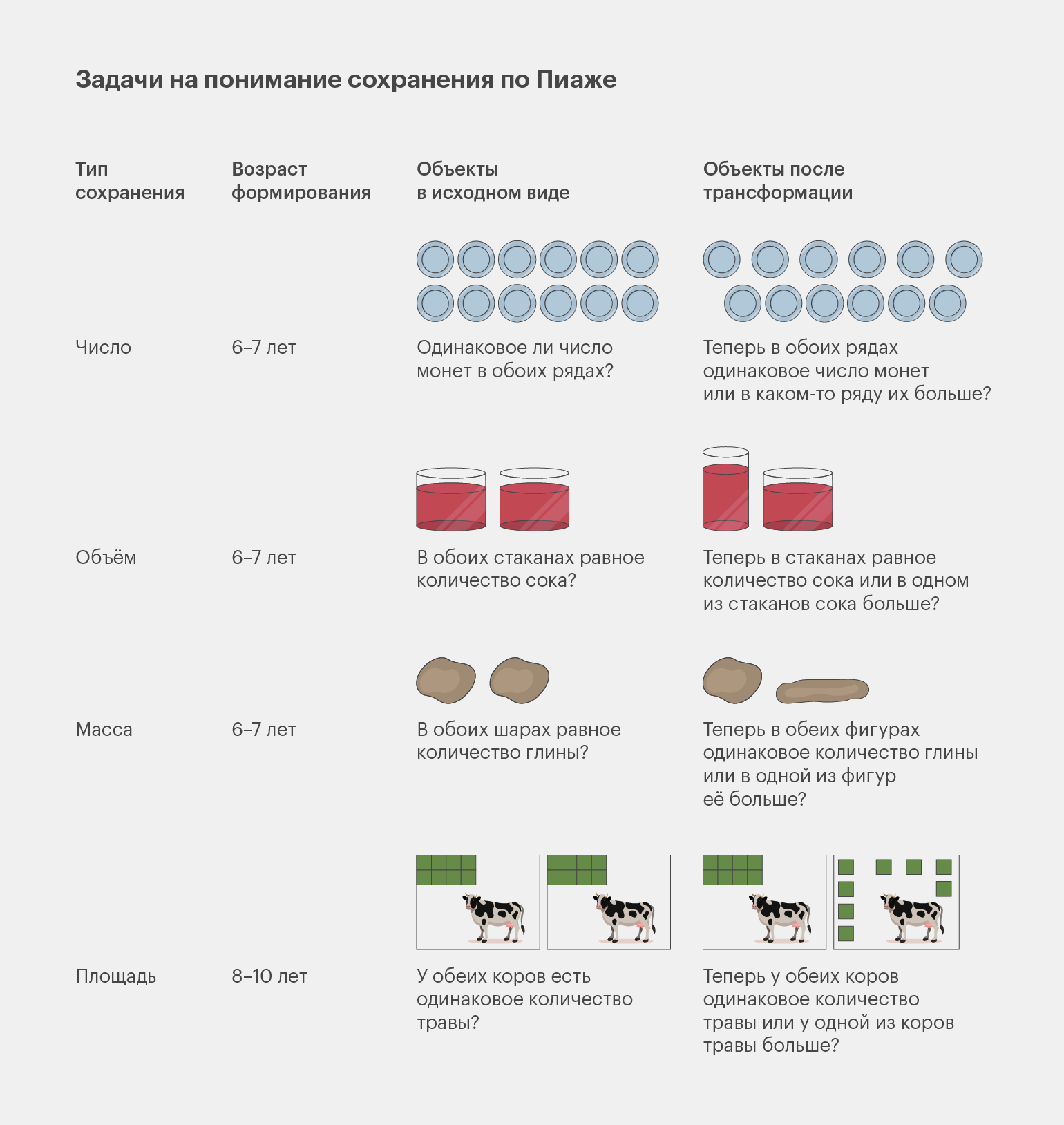 Приблизительно до 7 лет дети даже могут верить, что растворившийся в воде сахар исчезает, вместе со вкусом и объёмом. В возрасте 6–8 лет они понимают сохранение массы и объёма, но только к 9–10 годам постигают сохранение веса.