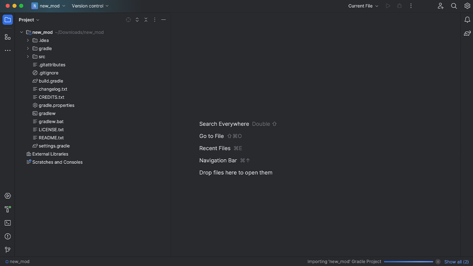 В файловом менеджере выберите папку с модом, которую мы скачали и распаковали на предыдущем шаге. После загрузки проекта слева от редактора появится панель с деревом проекта: в ней отображаются все папки и файлы мода, включая директории src, java и resources.
