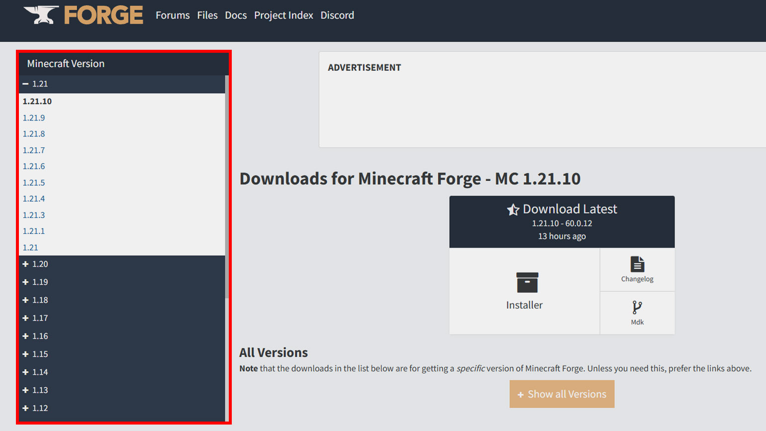 Перейдите на официальный сайт Forge и в левом углу выберите версию Minecraft, которую будете модифицировать. У нас будет версия 1.19.