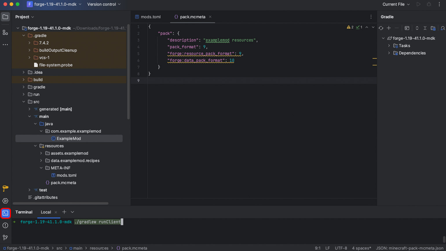 Ещё в папке src/main/resources должен находиться файл pack.mcmeta — в нём хранятся метаданные ресурспака, без которых мод не запустится. Если файла нет, создайте его и добавьте следующий код: