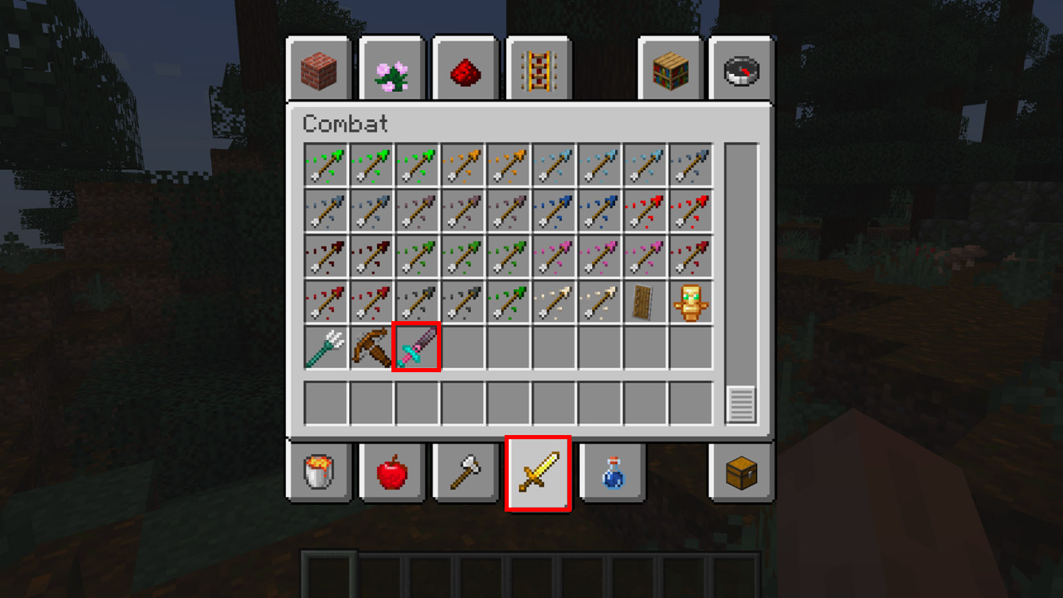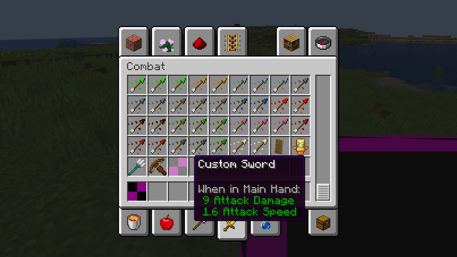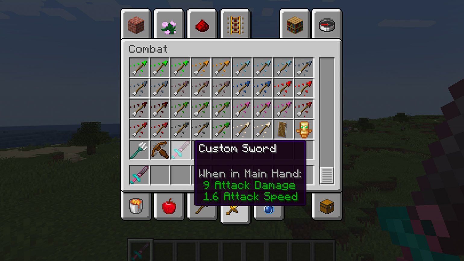 .tab(CreativeModeTab.TAB_COMBAT)  // Помещаем меч во вкладку с оружиемКогда вы создаёте новые инструменты, им нужно задать три свойства: материал (Tier), урон (Attack Damage) и скорость атаки (Attack Speed).