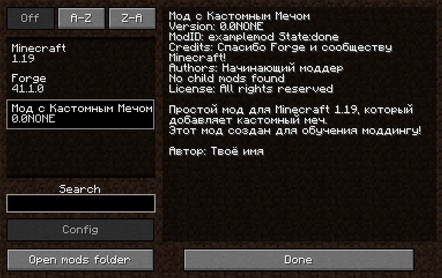Если на каком-то этапе у вас возникли трудности, вы можете скачать готовый мод с нашего диска и протестировать JAR-файл на своём компьютере. Но для корректной работы мода нужен Minecraft 1.19 с установленным Forge. В других версиях игры мод может не запускаться или работать с ошибками из-за несовместимости API.