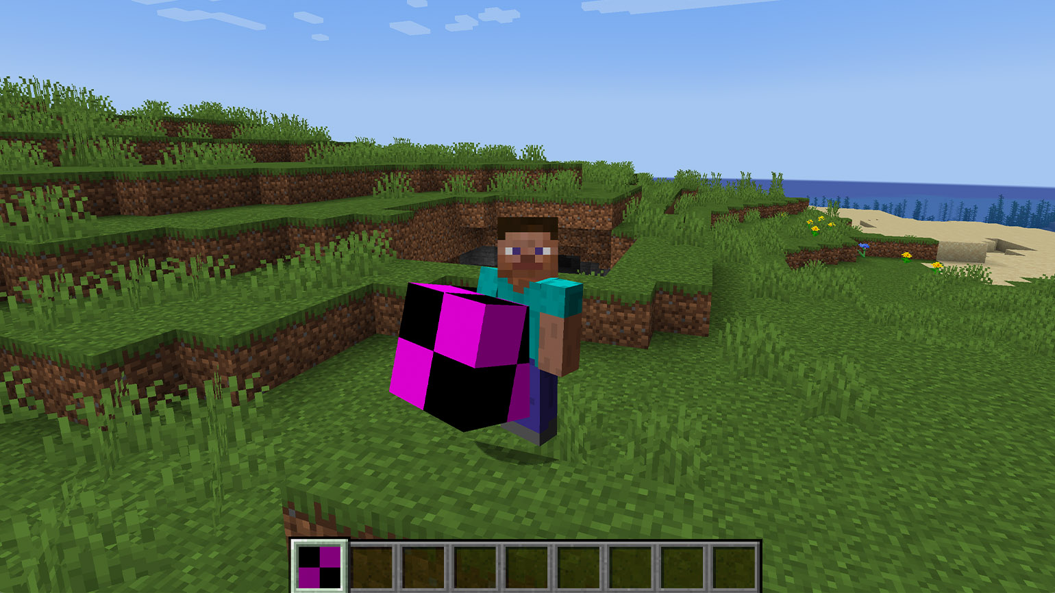 Наш меч может наносить урон, и его можно скрафтить, но в игре он выглядит как странный фиолетово-чёрный набор пикселей. Это стандартная заглушка Minecraft для отсутствующих текстур: