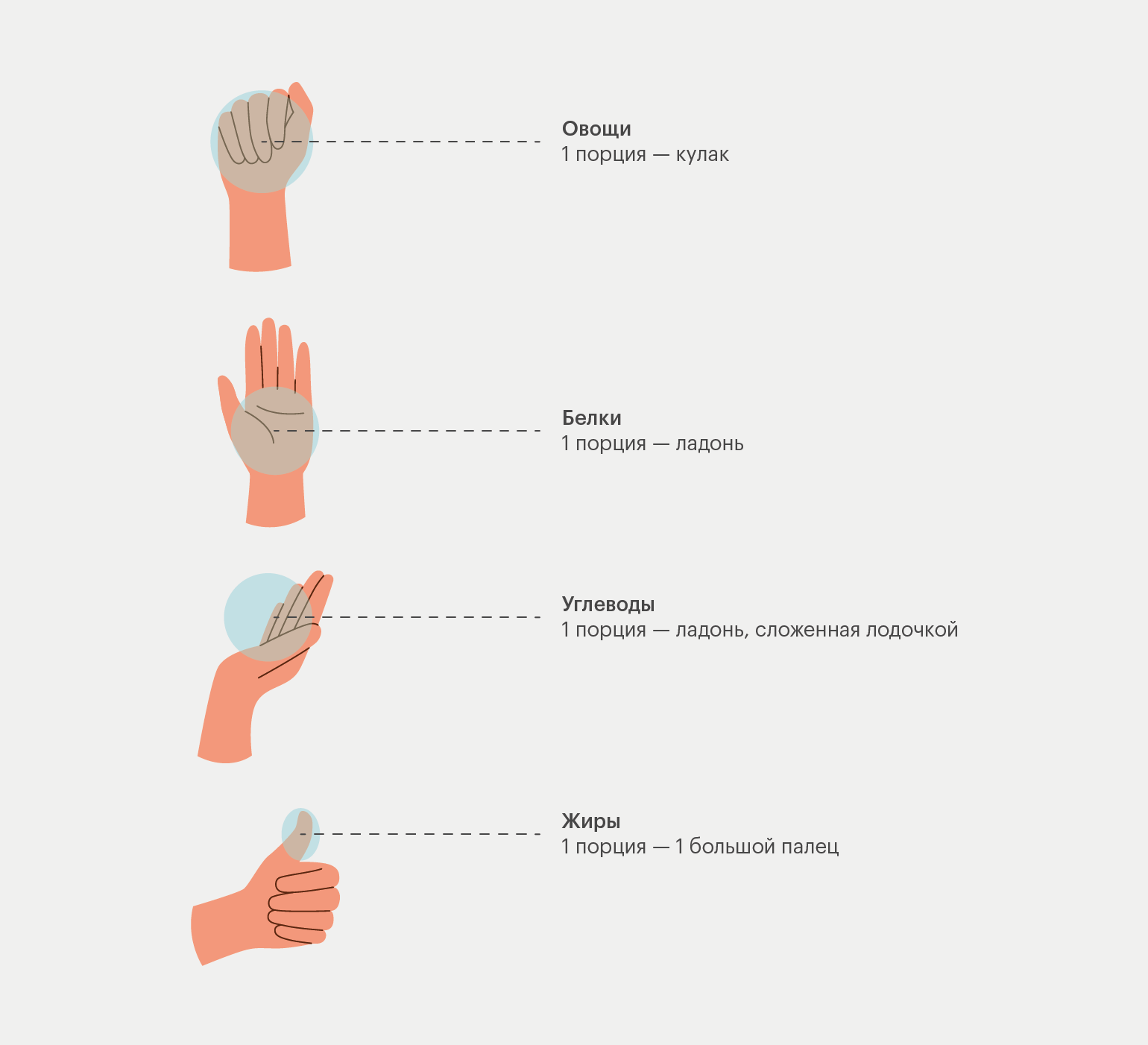 Ешьте всё то же, что ели раньше, но уменьшите объём, при этом сохраняя чувство сытости и энергию [5]. Для этого можно прибегнуть к методу «руки», который предлагает измерить порцию так [6]: