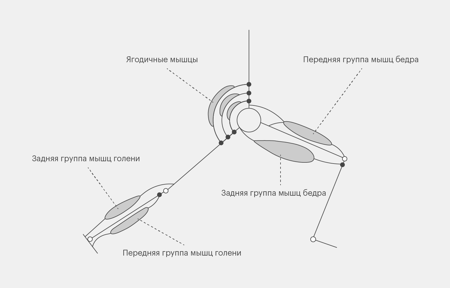Мощное разгибание ног происходит за счёт активизации ягодичных мышц и задней группы мышц бедра. Чем мощнее разгибание, тем лучше спринтер отталкивается, а это, как мы помним, главный момент разбега. Если у бегунов на длинные дистанции первой земли касается пятка, то у спринтеров — передняя часть стопы. Таким образом, приземление и отрыв происходят в одной точке ноги [4], [5].