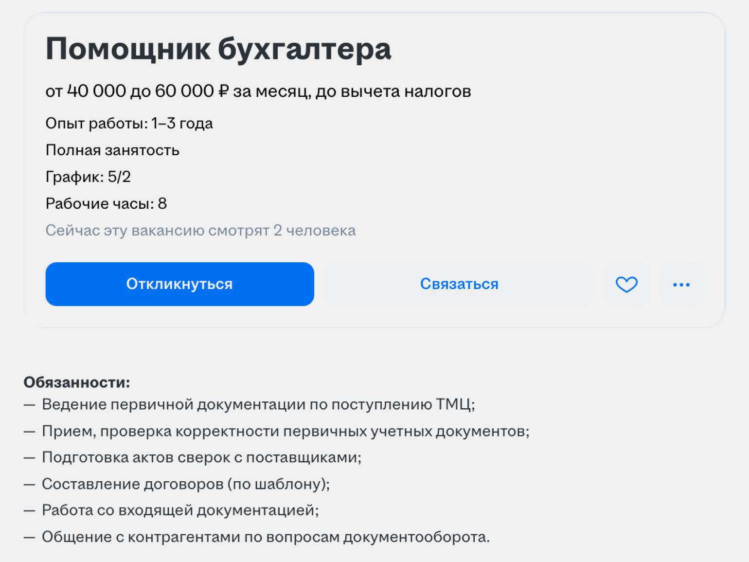 Помощник бухгалтера. Это начальная ступень карьеры в сфере бухгалтерии. Помощники работают под руководством более опытных бухгалтеров: выполняют рутинные задачи бухучёта. Например, обрабатывают и систематизируют первичные документы, выставляют счета-фактуры, готовят платёжные поручения и так далее. Вот пример обязанностей помощника бухгалтера в одной из вакансий HeadHunter.