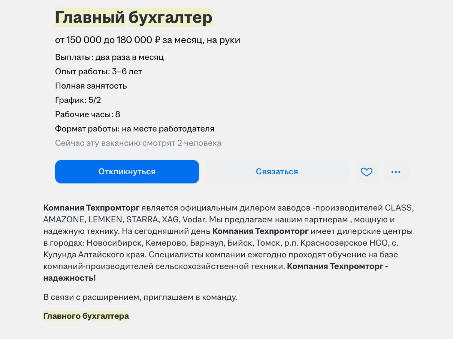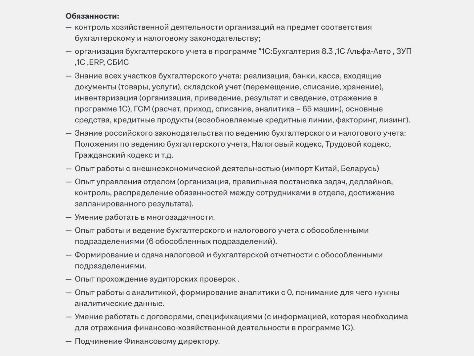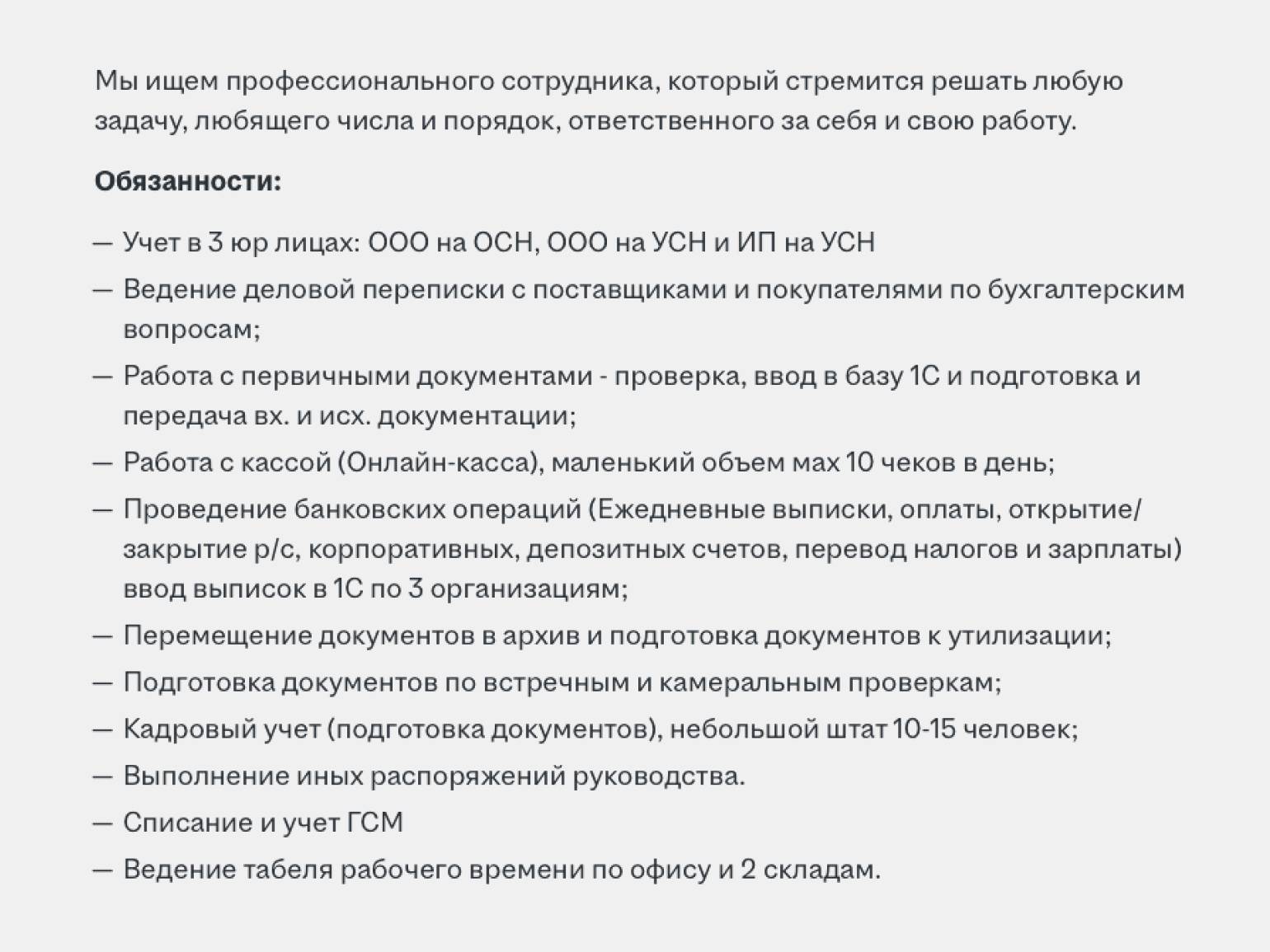 - Сфера деятельности компании. Например, в торговых компаниях бухгалтеры должны вести складской учёт, а в консалтинговых — расчёты с заказчиками.