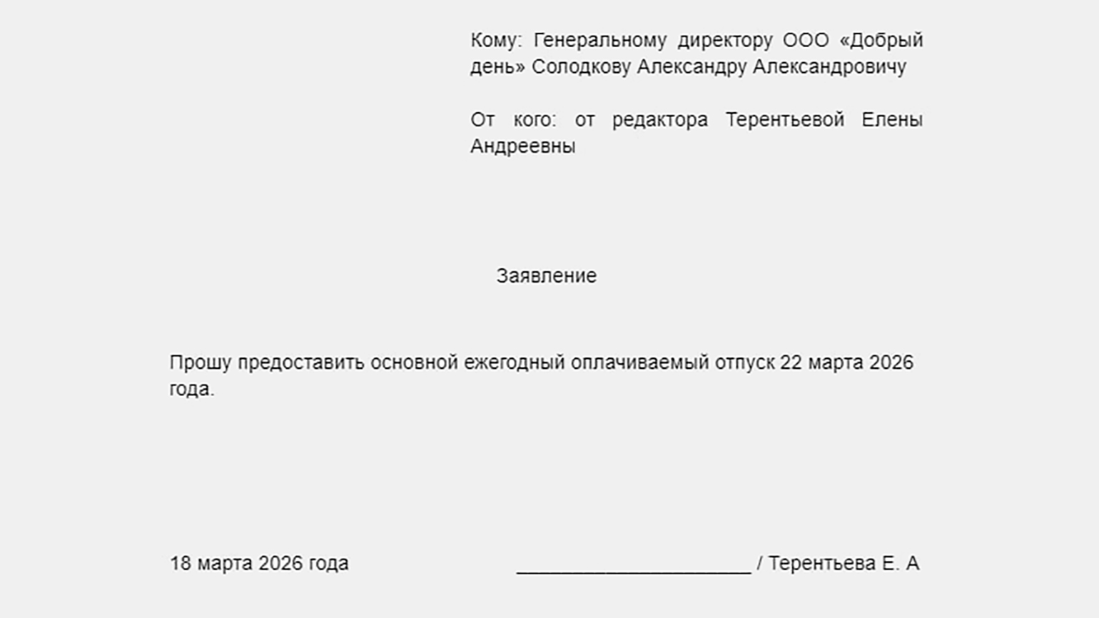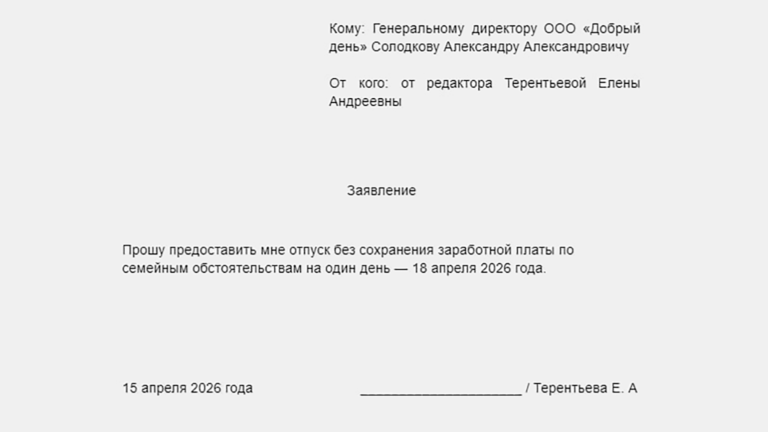 Дальше разберём примеры заявлений на отгул по разным основаниям.