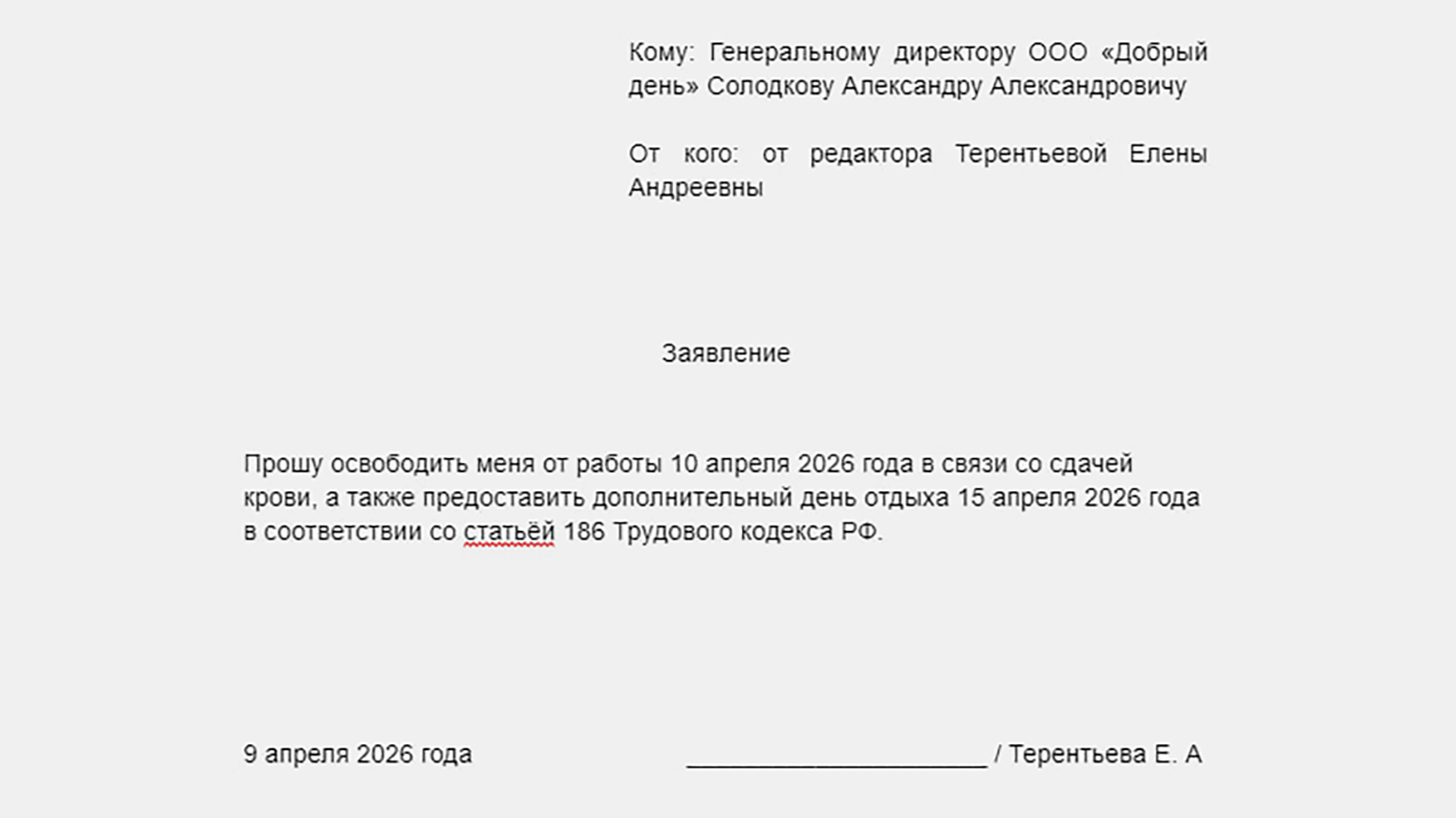 Образец заявления на отгул по причине донорства крови и её компонентов можно посмотреть по ссылке.