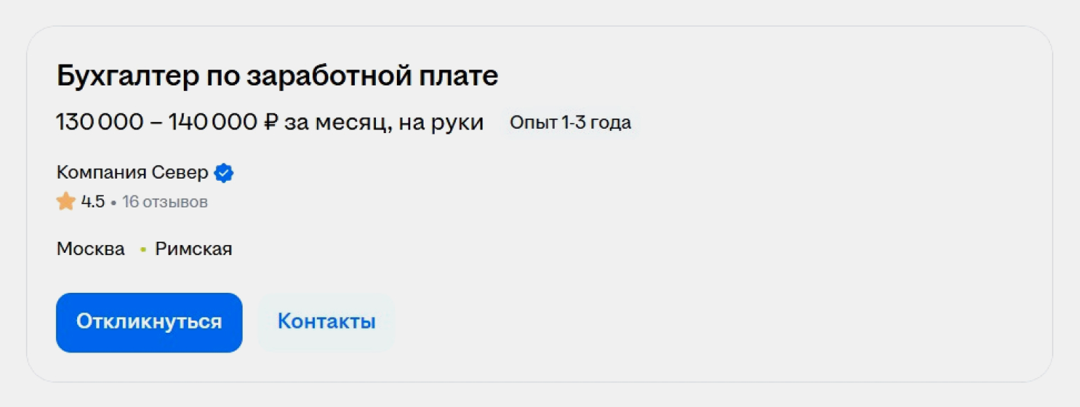 В Москве аналогичную зарплату предлагают бухгалтерам со стажем 1–3 года. Более опытные специалисты могут получать от 150 тысяч рублей.