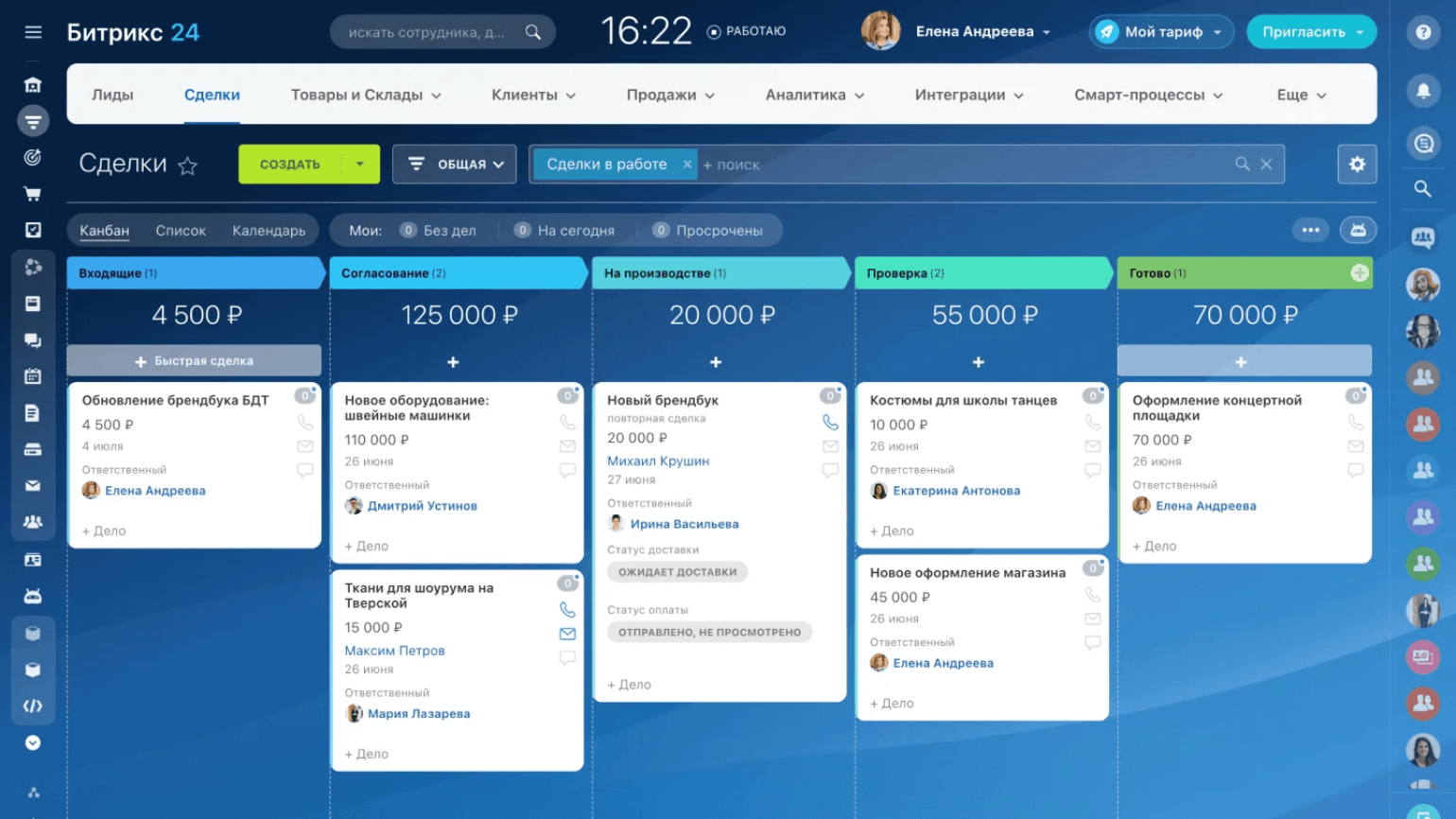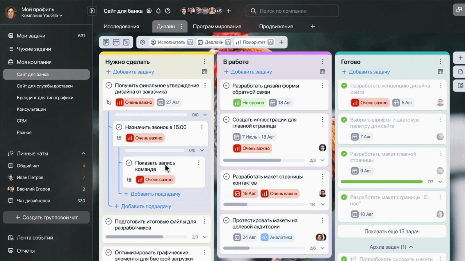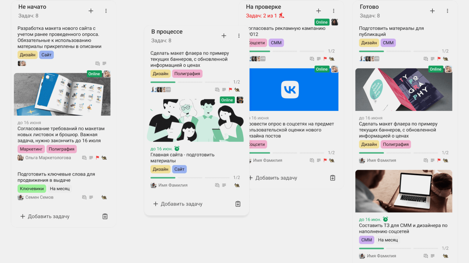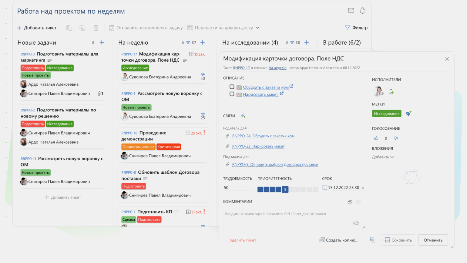 - Agile-доски — можно назначать задачи из карточек и отправлять их исполнителям.